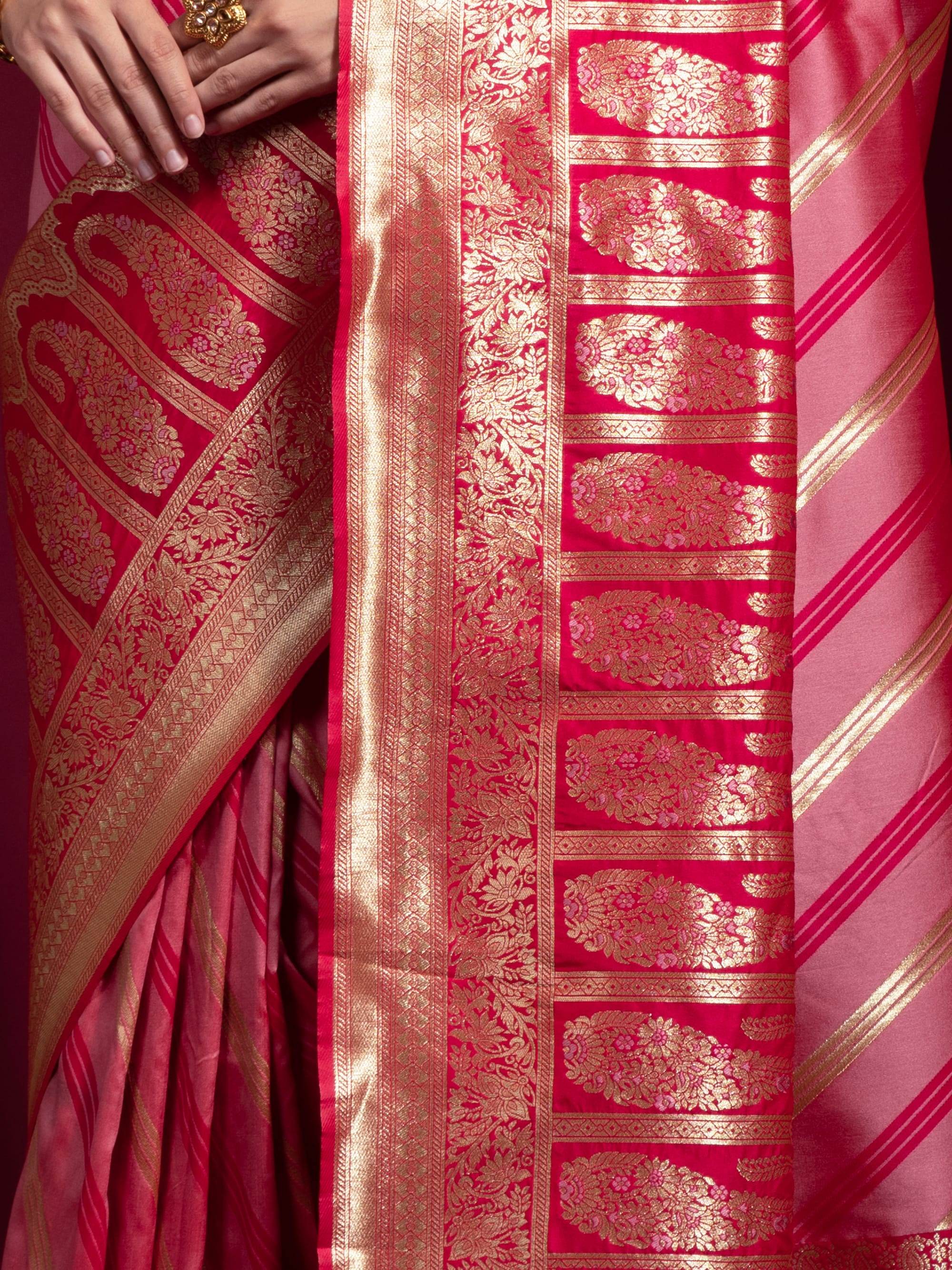This engaging pink silk fabric saree is 5.50 meters long and comes with unstitched blouse material.