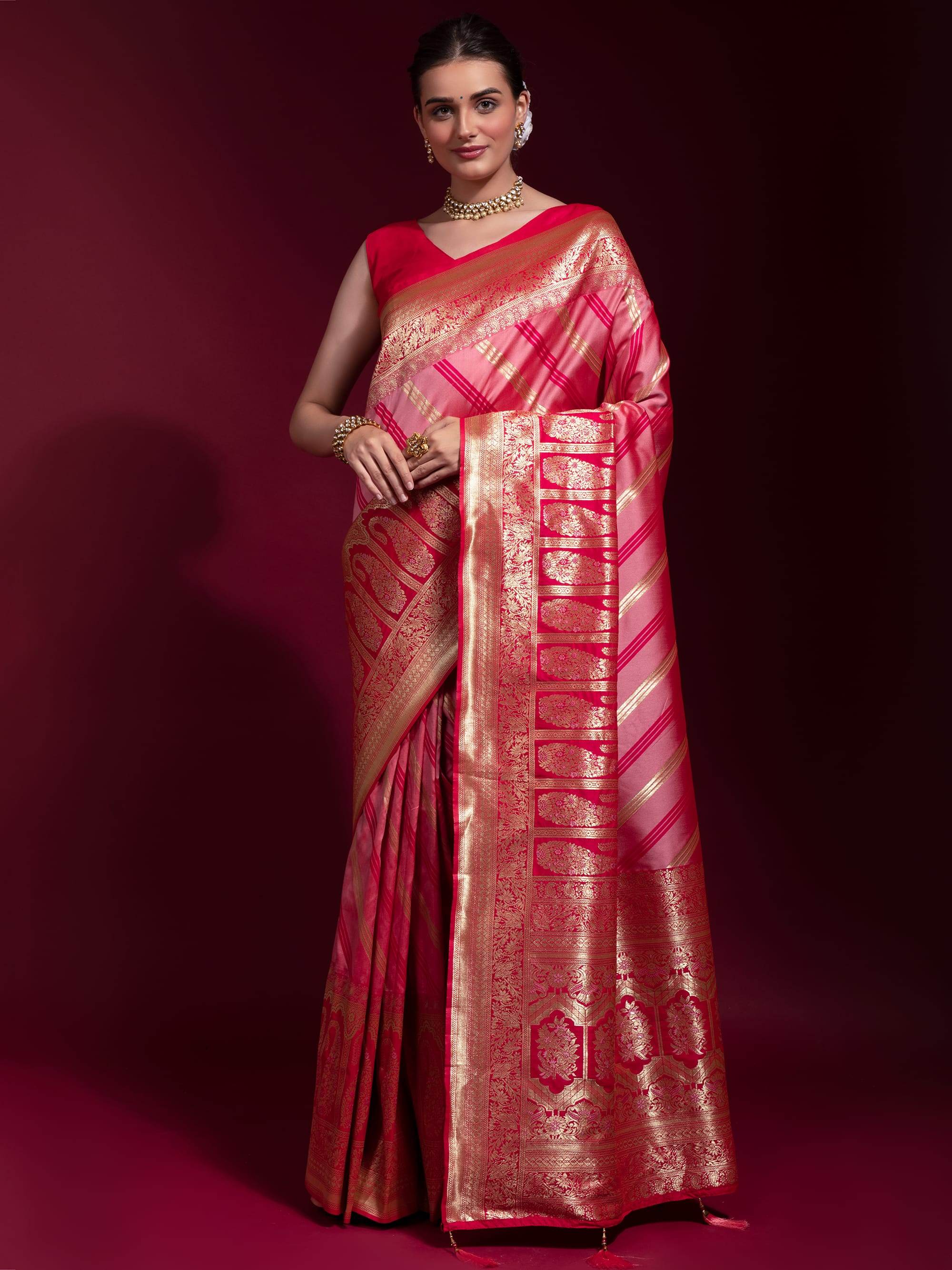Look trendy wearing this adorable pink-colored silk material saree created with rich zari weaving work all over it and tassels on the edge.
