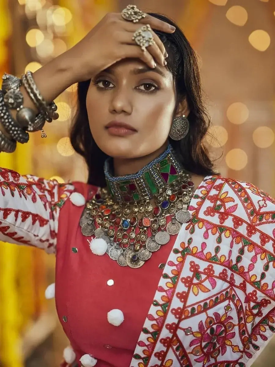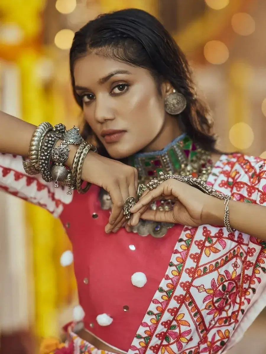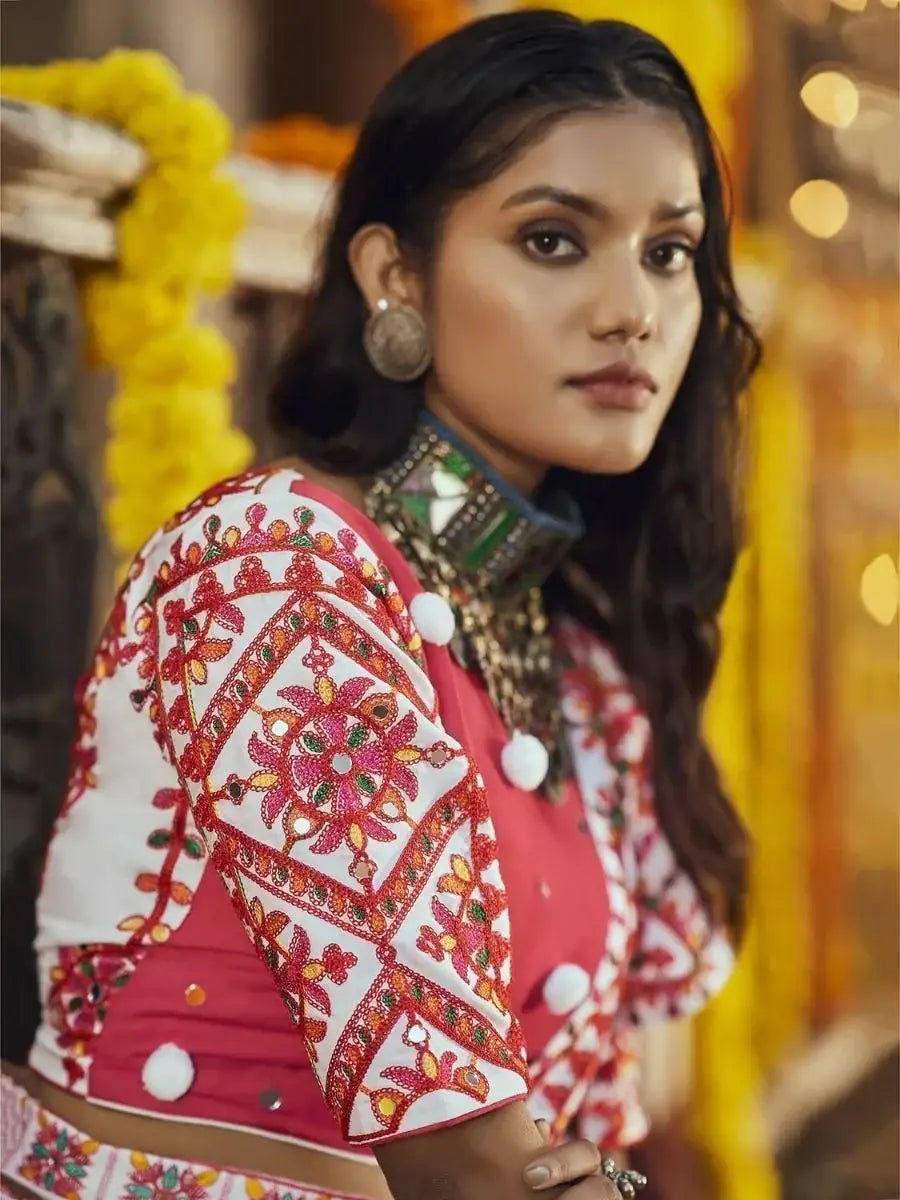 This charming fancy chaniya comes with deep pink color maslin cotton fabric half sleeves and boat neck choli designed with thread embroidered with mirror work and white color similar fabric dupatta crafted with thread embroidered with all-over mirror pasting work stall style dupatta work(2.30 mtr).