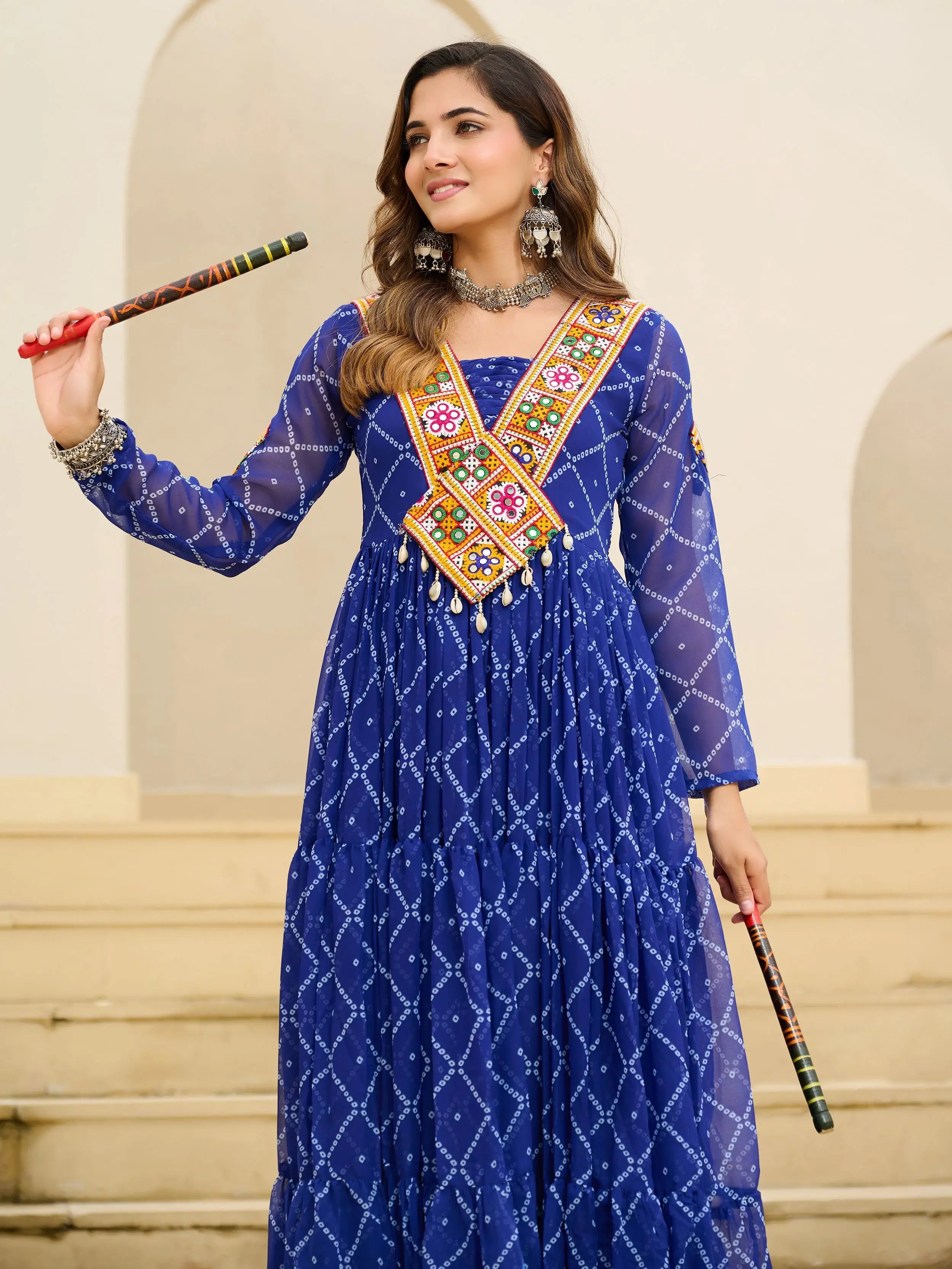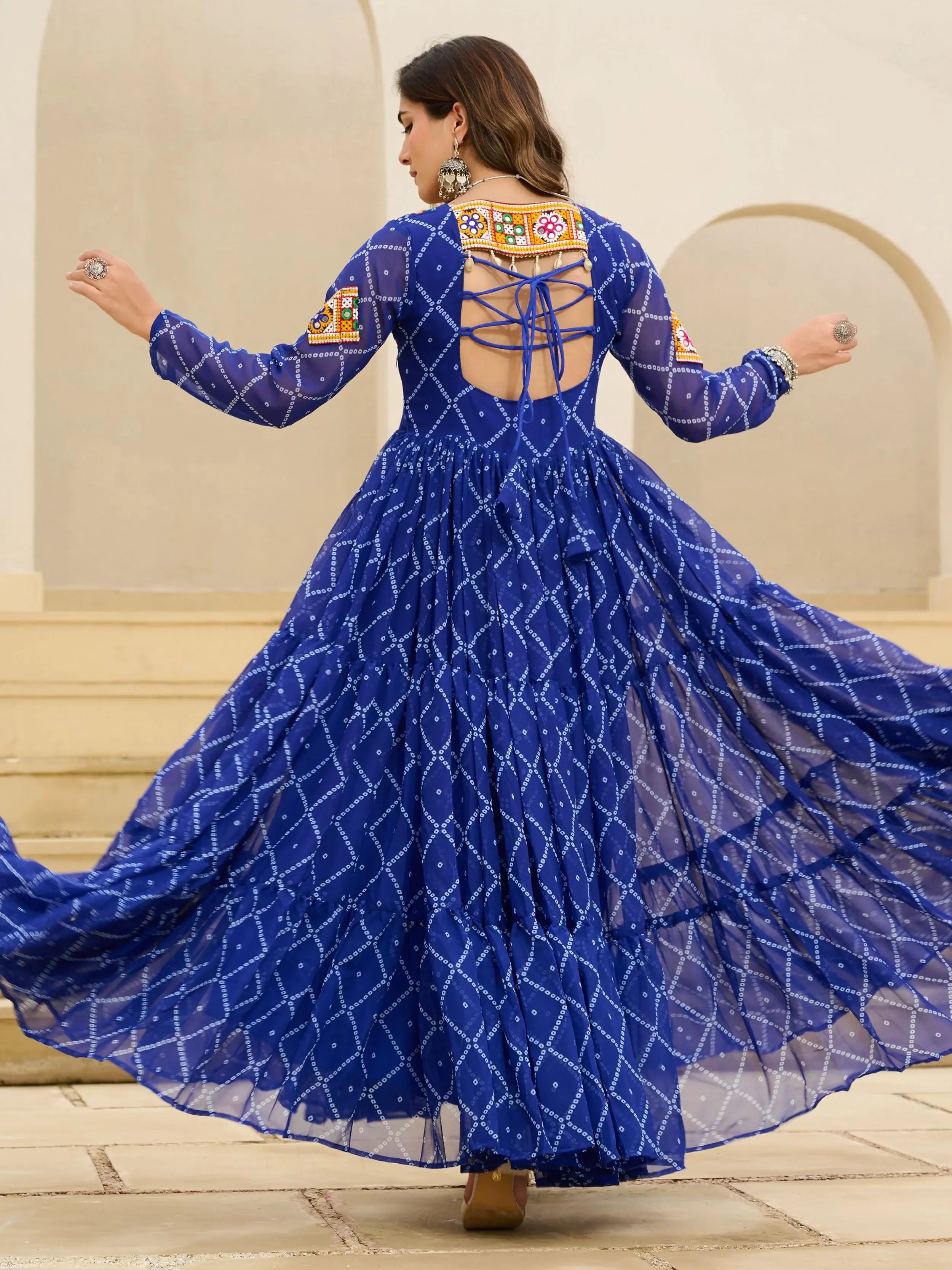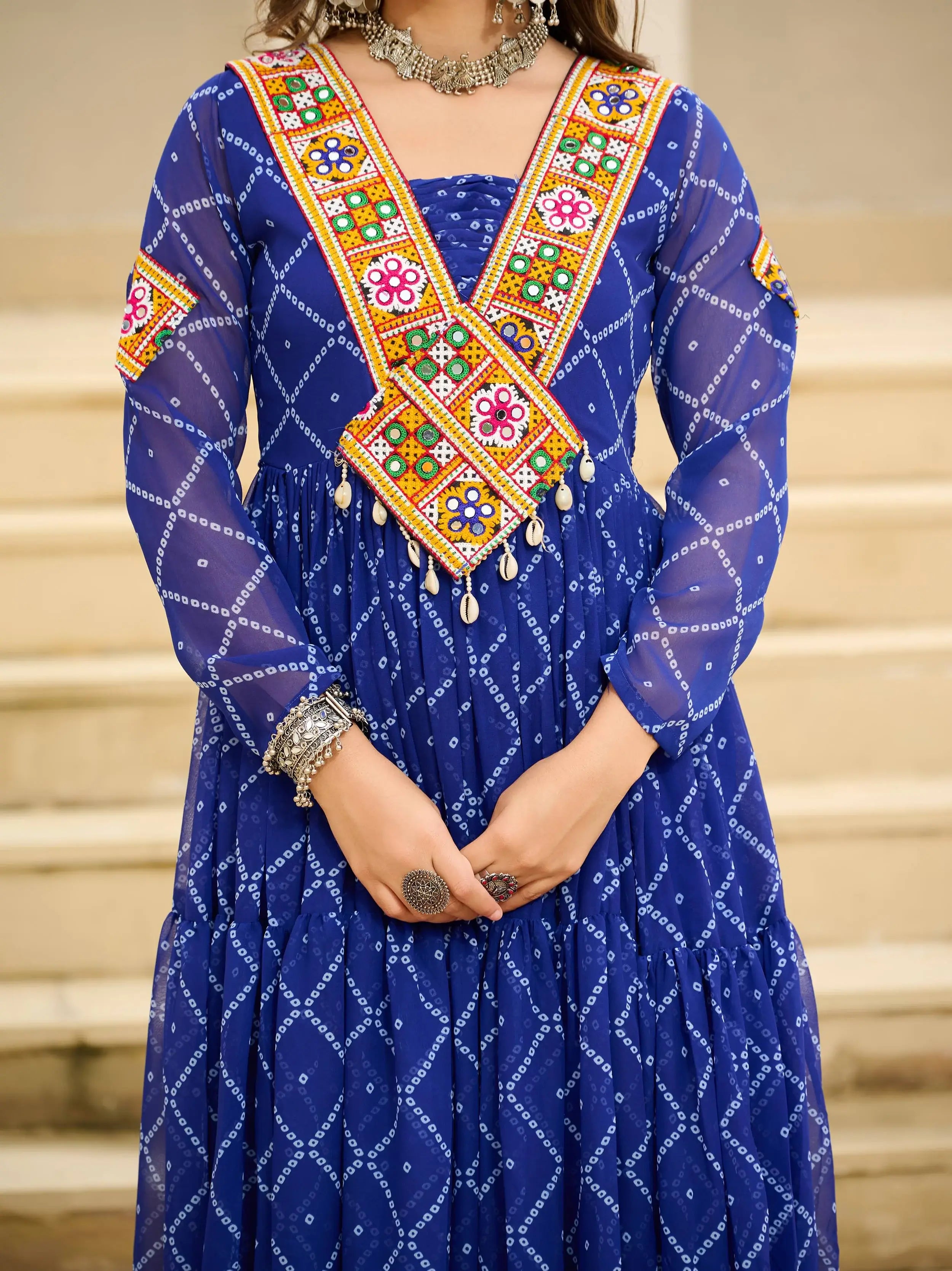 This stunning blue faux georgette gown features a vibrant Bandhani print adorned with intricate Kutchi patchwork for a traditional yet striking appeal. Designed with a flattering L size fit, it comes pre-stitched at 40 inches, allowing adjustment between 38" to 44" for a comfortable and custom fit.