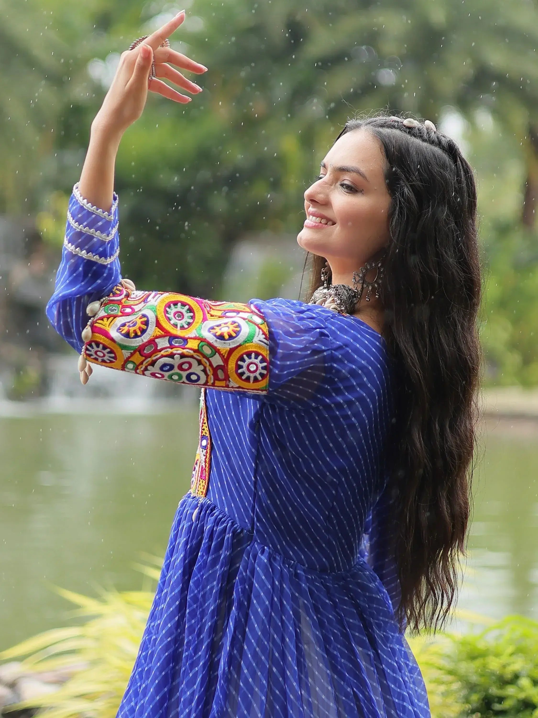 Celebrate navratri in style with our blue mirror work cotton kurti paired with a cream lehenga, perfect for festive occasions. Crafted from high-quality cotton, this set features elegant embroidery and mirror work that offers a chic, traditional look.