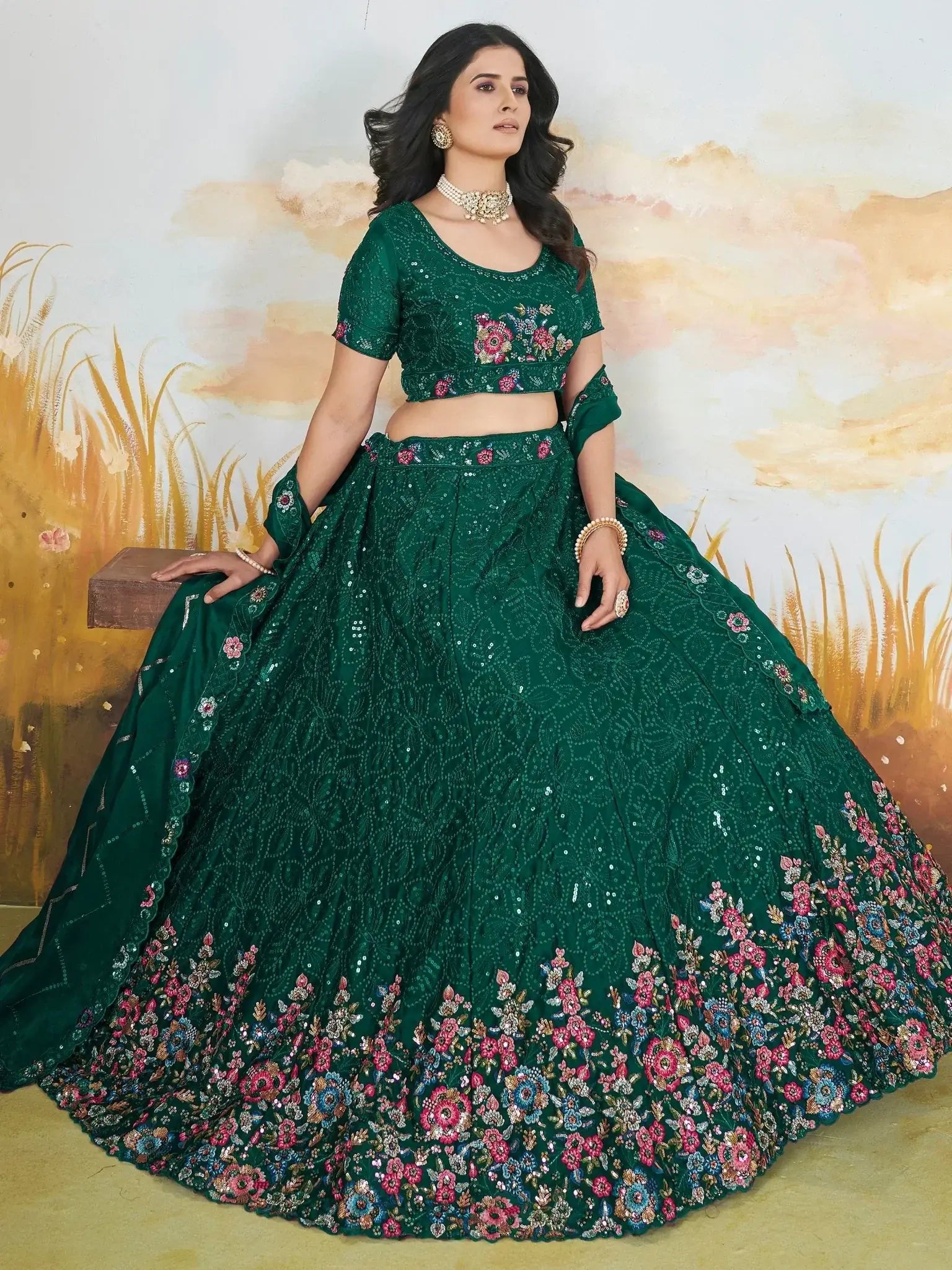 The georgette dupatta in a similar green color complements the outfit with its thread and floral embroidered work, sequin embellishments, and attractive lace work. The semi-stitched lehenga can fit up to 42 inches, providing a comfortable and customizable fit.