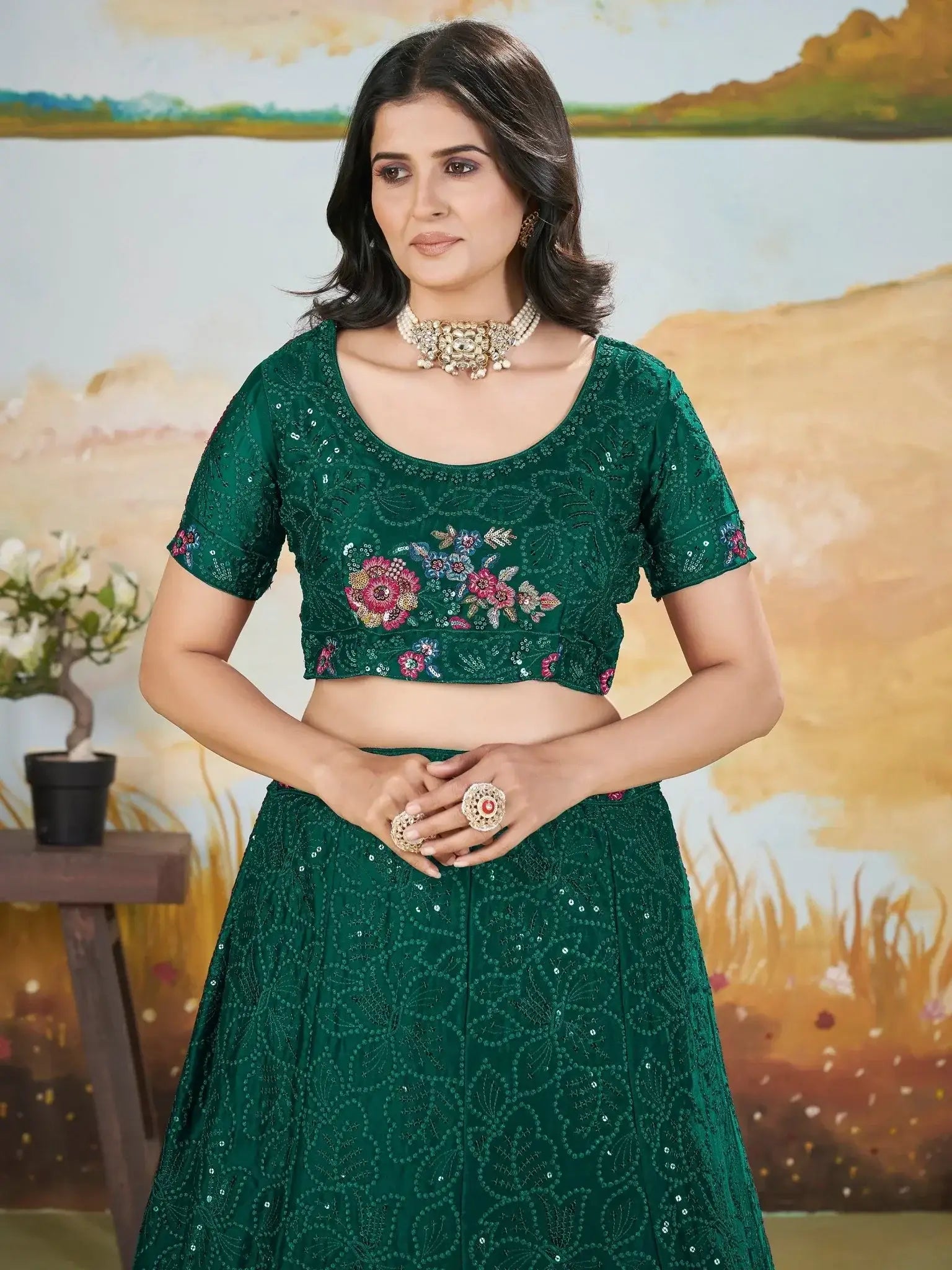 This beautiful ensemble features a green-color chinon lehenga with intricate thread and floral embroidered work, as well as sequin embellishments. The matching chinon choli also boasts the same embroidery work and sequin detailing, creating a cohesive and elegant look.