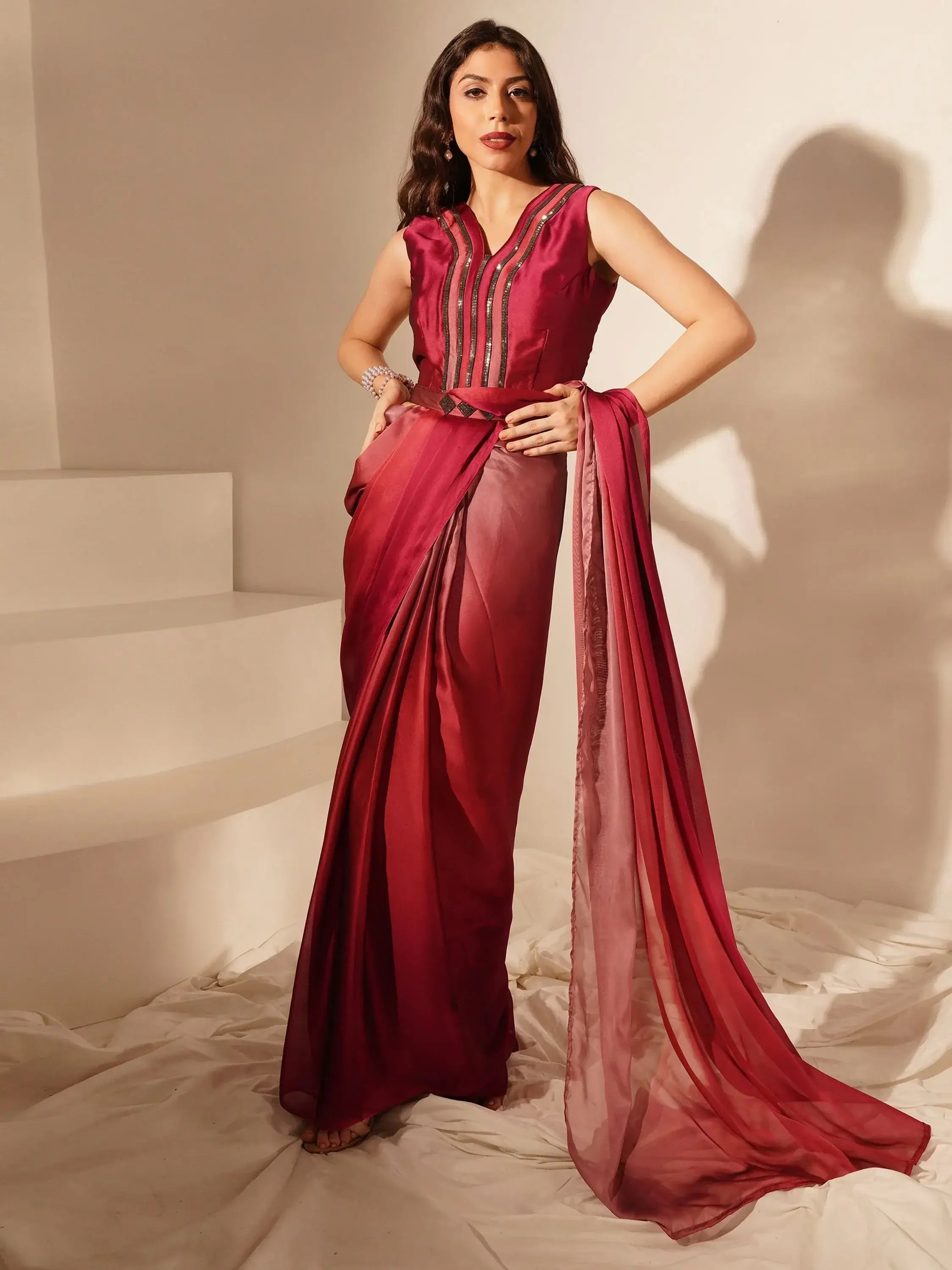 Ideal for weddings and festive celebrations, this pleated saree with an open pallu is designed to make you stand out. Its rich maroon hue and elegant design make it a perfect choice for making lasting impressions.