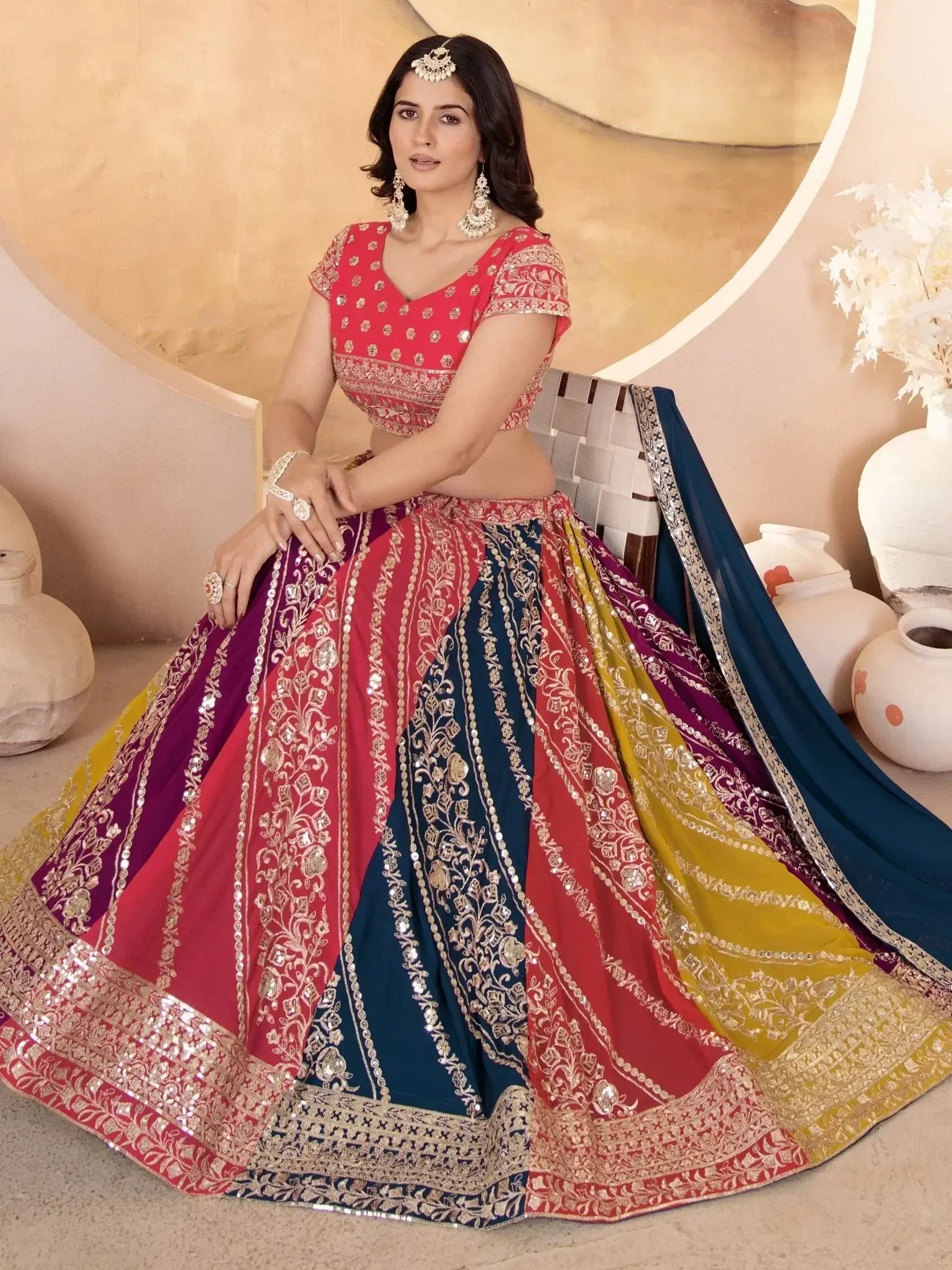 This stunning ensemble features a multi-color georgette lehenga with intricate sequin and thread embroidered work, paired with a coral pink georgette choli also embellished with sequin and thread embroidery. The look is completed with a beautiful blue georgette dupatta featuring thread embroidery and sequin work with a designer lace border.