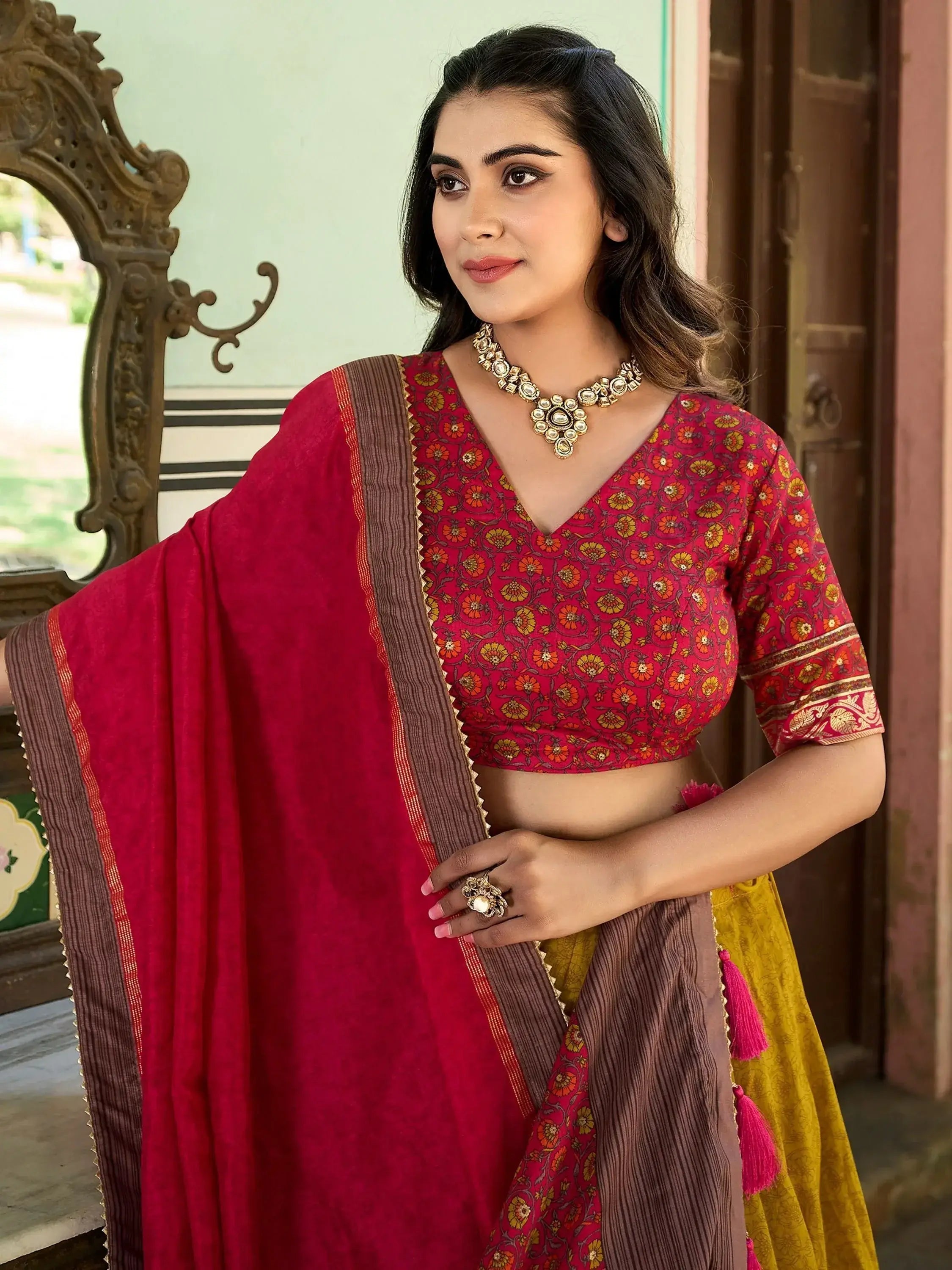 Accompanying the lehenga is a stunning pink tussar silk choli, embellished with matching foil print work that beautifully complements the richness of the mustard yellow lehenga. The unstitched choli provides versatility in styling, allowing you to tailor it to your desired fit and silhouette. Adding to the ensemble's allure is a delicate pink tussar silk dupatta, adorned with print work on both sides and finished with charming tassels, adding a playful yet elegant touch to the overall look.