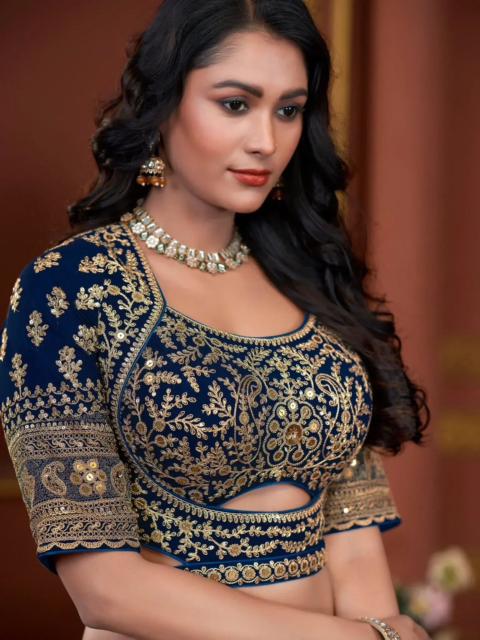 The fully stitched navy blue lehenga choli is available in sizes ranging from S to XL, ensuring a perfect fit for every body type. The rich navy blue color and elaborate embellishments make this set ideal for weddings and special occasions.