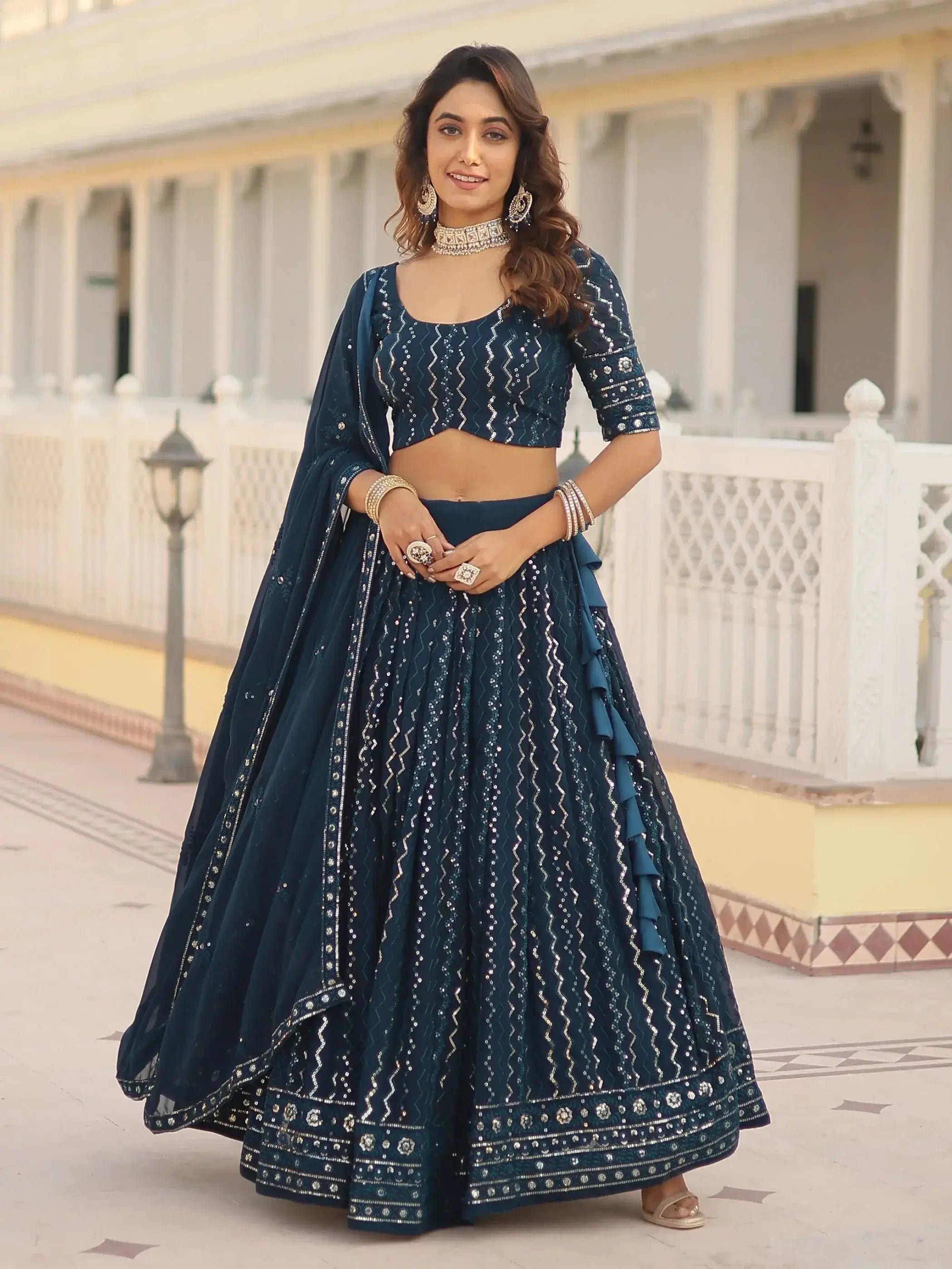 This "adorable navy blue sequins georgette sangeet wear lehenga choli" is a versatile and timeless outfit that can be worn for various occasions, from weddings to festive celebrations. The high-quality fabric and detailed embroidery work ensure a luxurious and elegant look that will make you stand out in the crowd. Don't miss the opportunity to add this stunning ensemble to your ethnic wear collection.