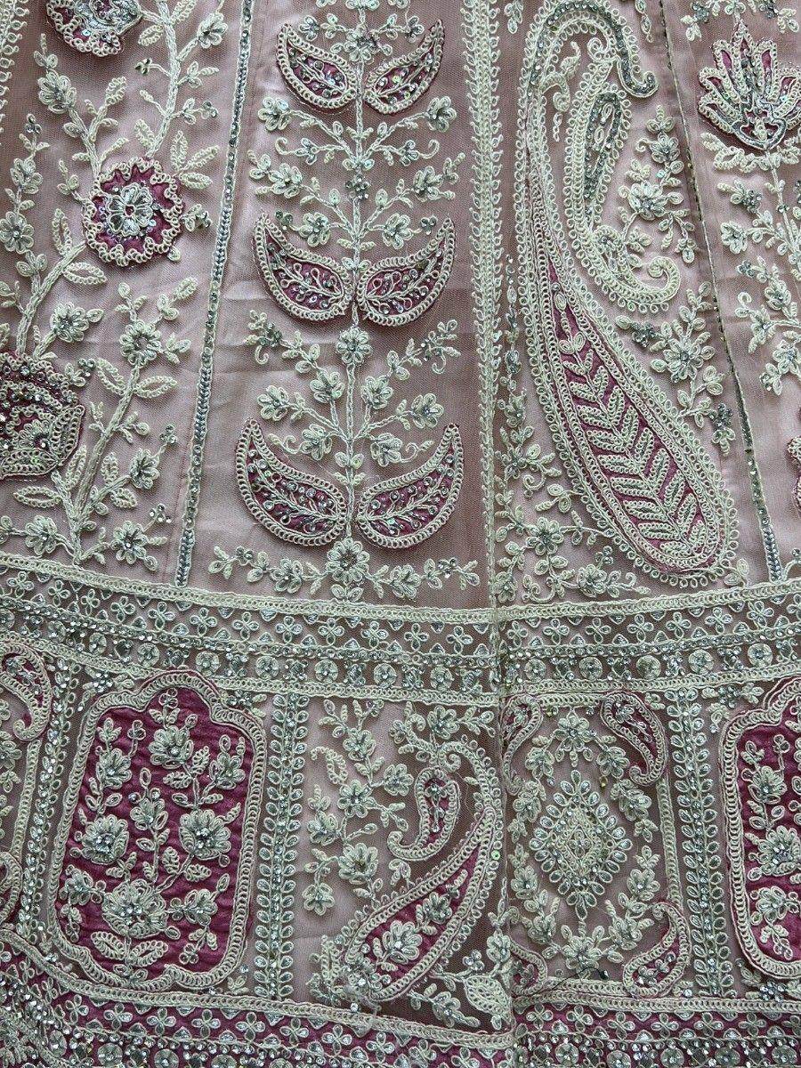 The matching choli is embellished with net material and showcases exquisite dori, threadwork, embroidered details, and dazzling diamond work. The set also includes a similar color net dupatta with embroidered butties and a heavy border lace work for added charm and grace.