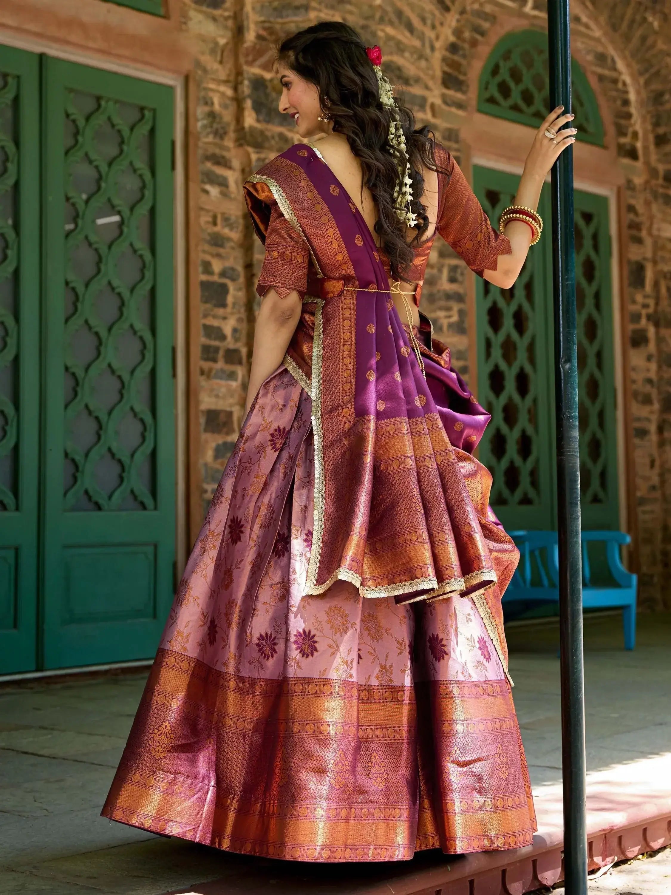 This adorable pink & purple zari weaving jacquard half saree lehenga is fully customizable to ensure the perfect fit. Don't miss out on this must-have piece for your wardrobe. Upgrade your style with the adorable pink & purple zari weaving jacquard half saree lehenga and make a fashion statement at your next special event.