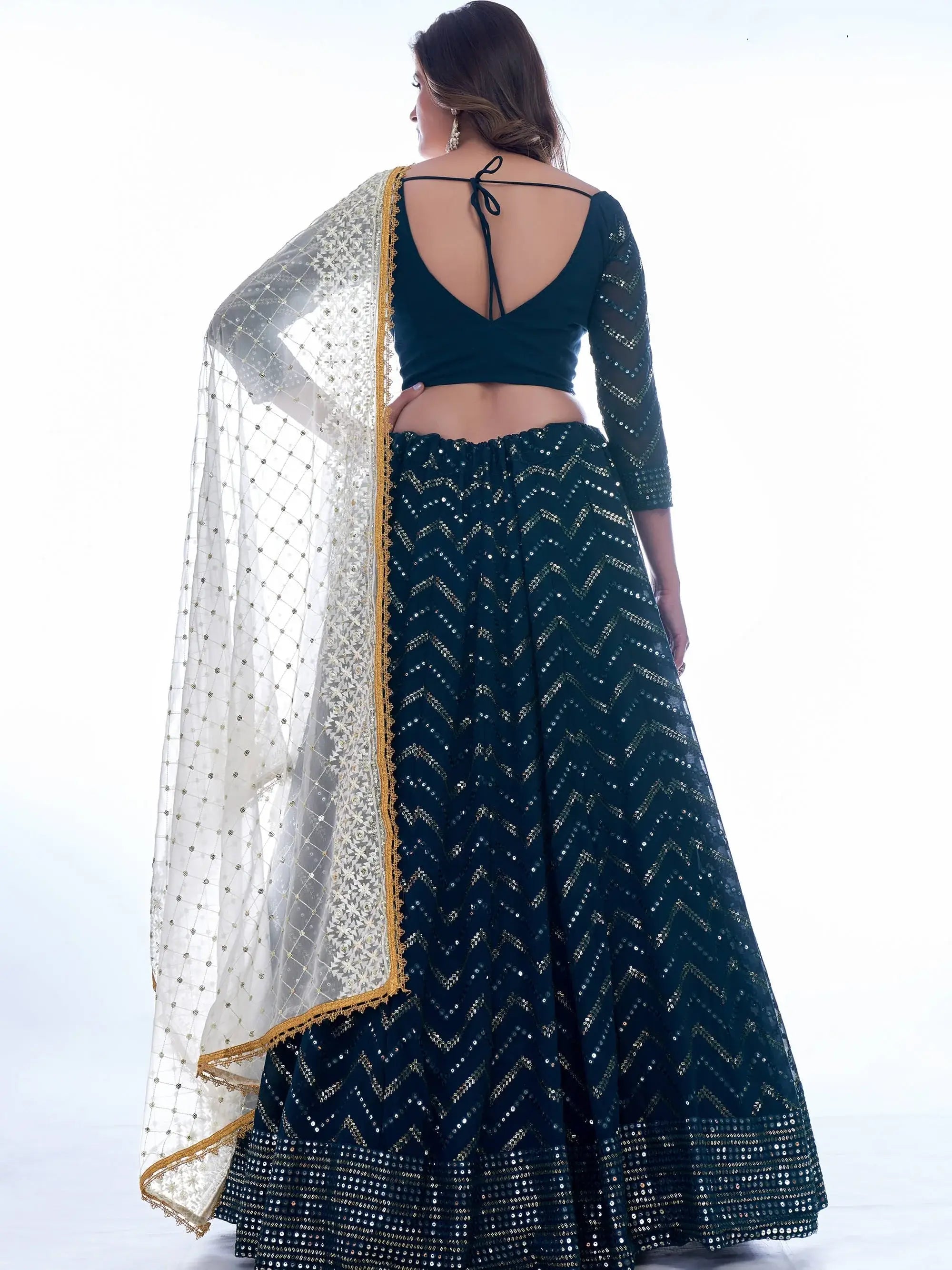 Add elegance and charm to your appearance by dressing in this gorgeous rama color lehenga choli. This rama lehenga is made of georgette material beautified with sequence work and thread embroidered.