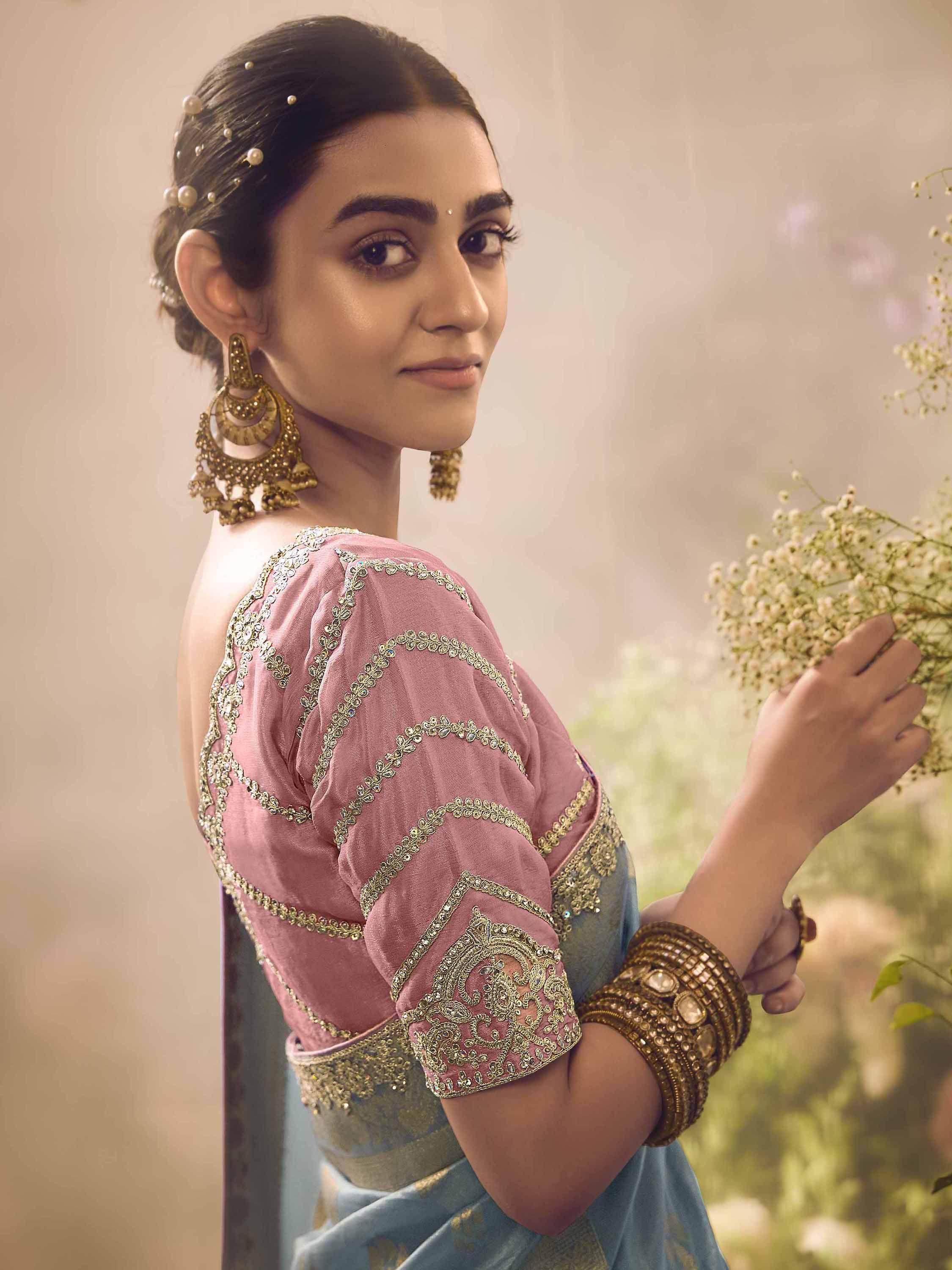 Memorialize your upcoming events, festivals, weddings, and special occasions with the ethereal beauty of our adorable sky-blue zari weaving organza saree with blouse. This stunning saree features intricate zari weaving work on a sky-blue organza fabric, exuding elegance and charm.