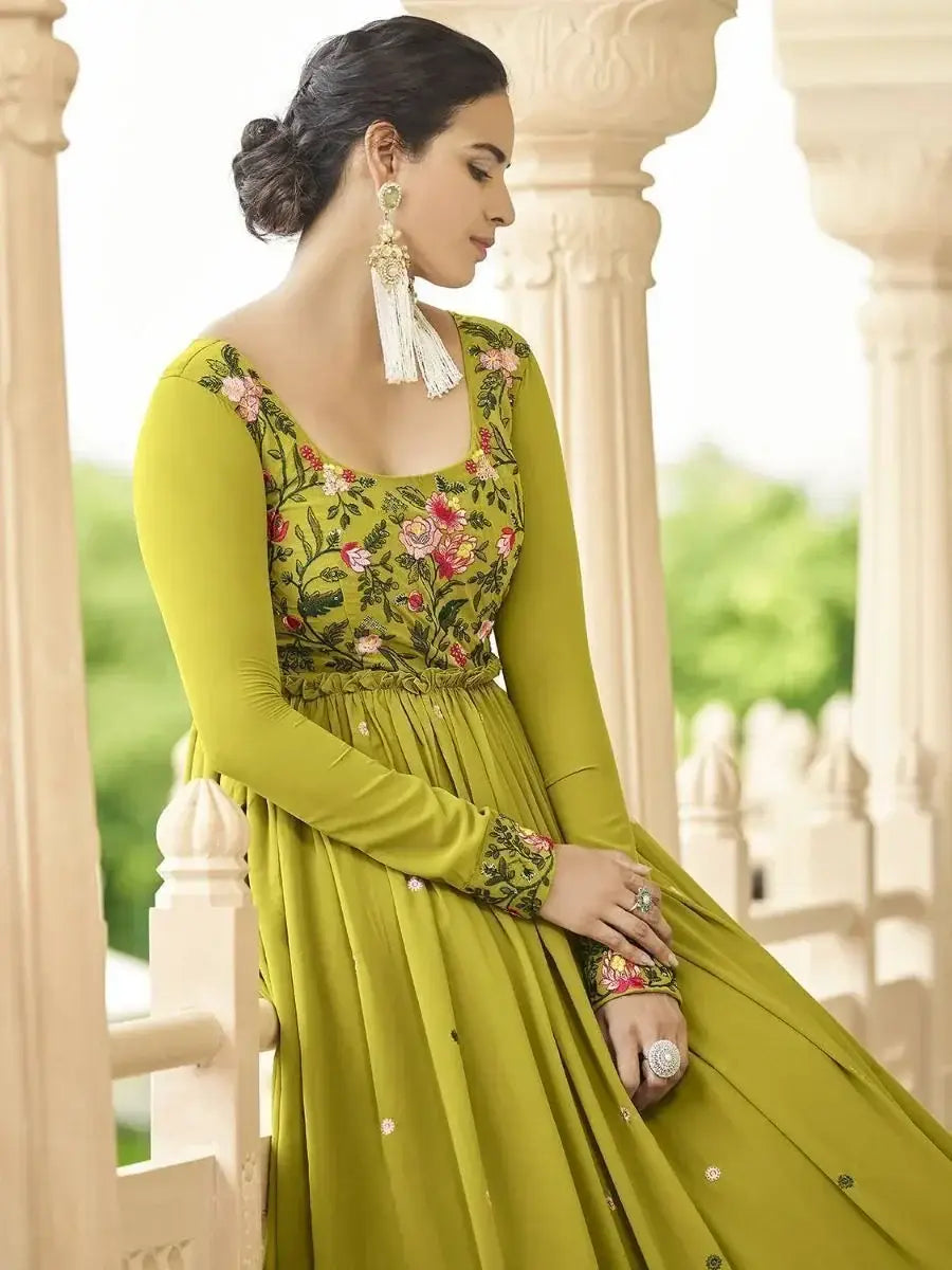 Be the sunshine of anyone’s eyes dressed in this adorning fluorescence green color georgette fabric long Anarkali gown created with embroidered work and up front side floral thread, and sequins work.