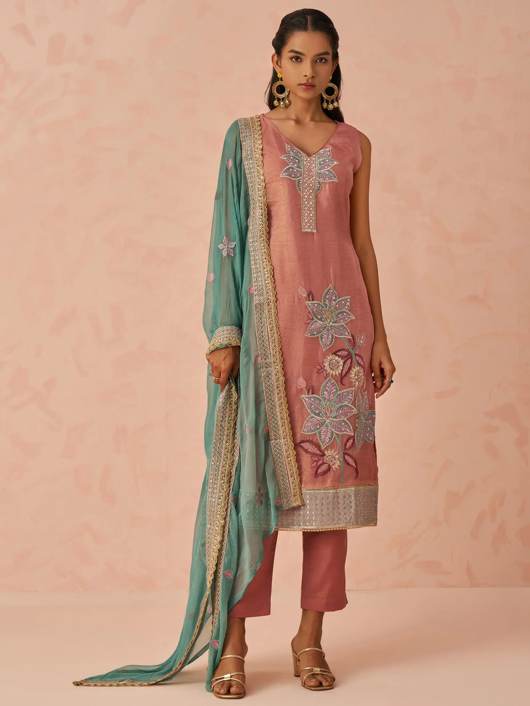 Step into elegance with this aesthetic peach crush silk pant suit, thoughtfully crafted for special event functions. The straight-cut top features delicate floral thread and sequins embroidery work, adding a soft shimmer and a touch of traditional charm. The gentle peach hue paired with the rich texture of crush silk gives this outfit a refined and graceful appeal.