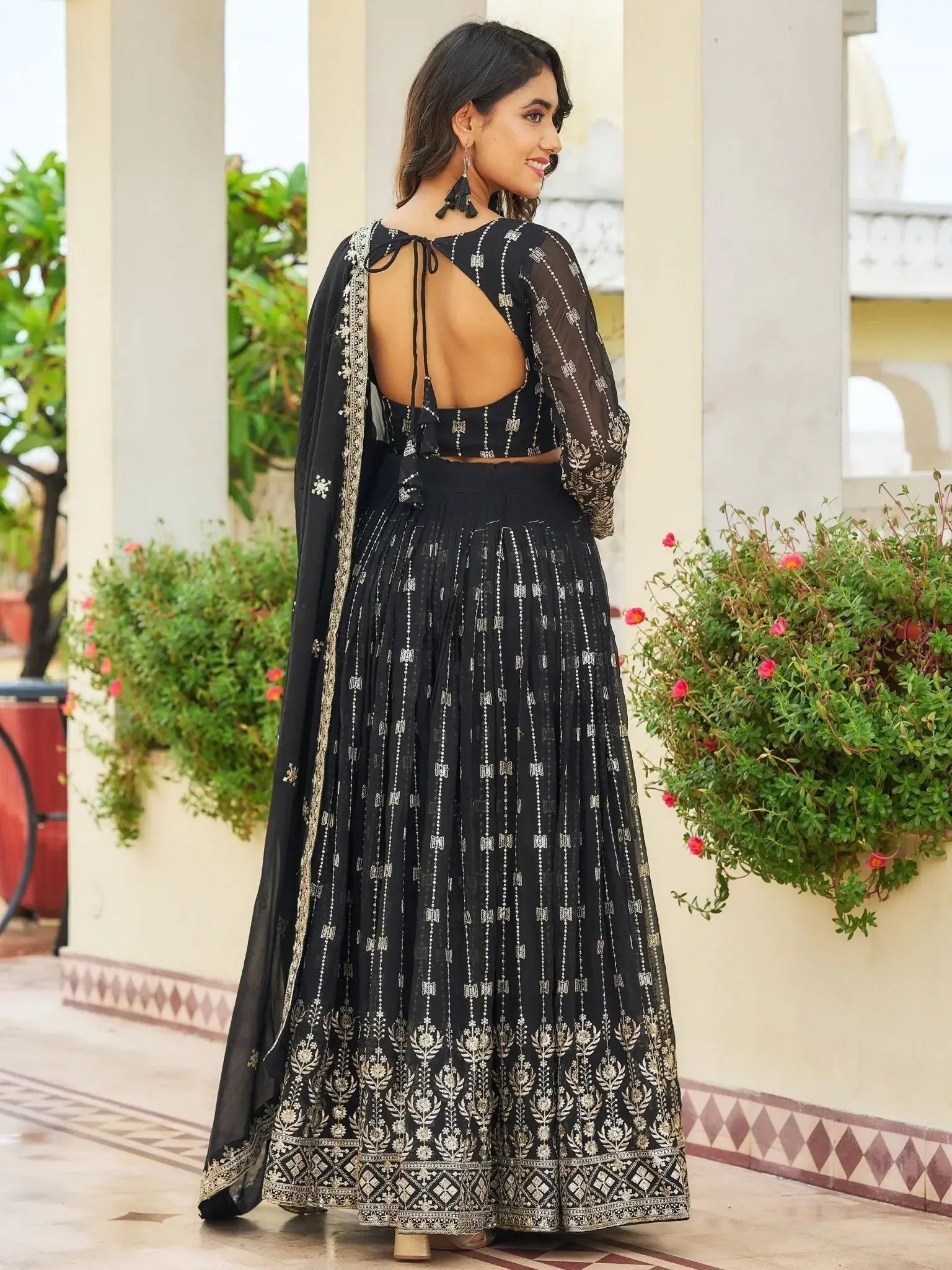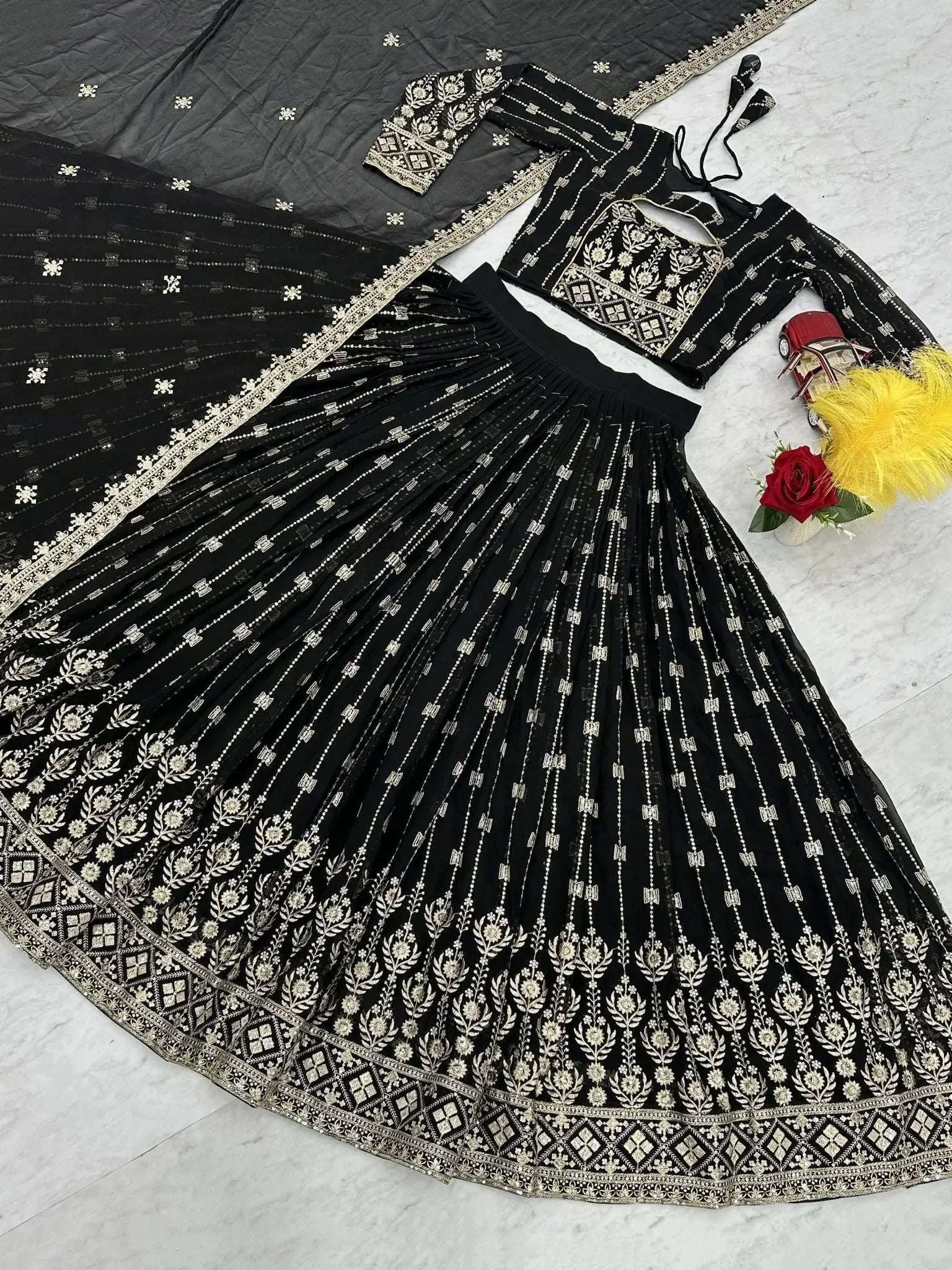 Introducing our elegant black lehenga choli set, crafted to embody sophistication and grace for any special occasion. The lehenga features exquisite embroidery and sequence work, adding a refined touch of elegance to your look.