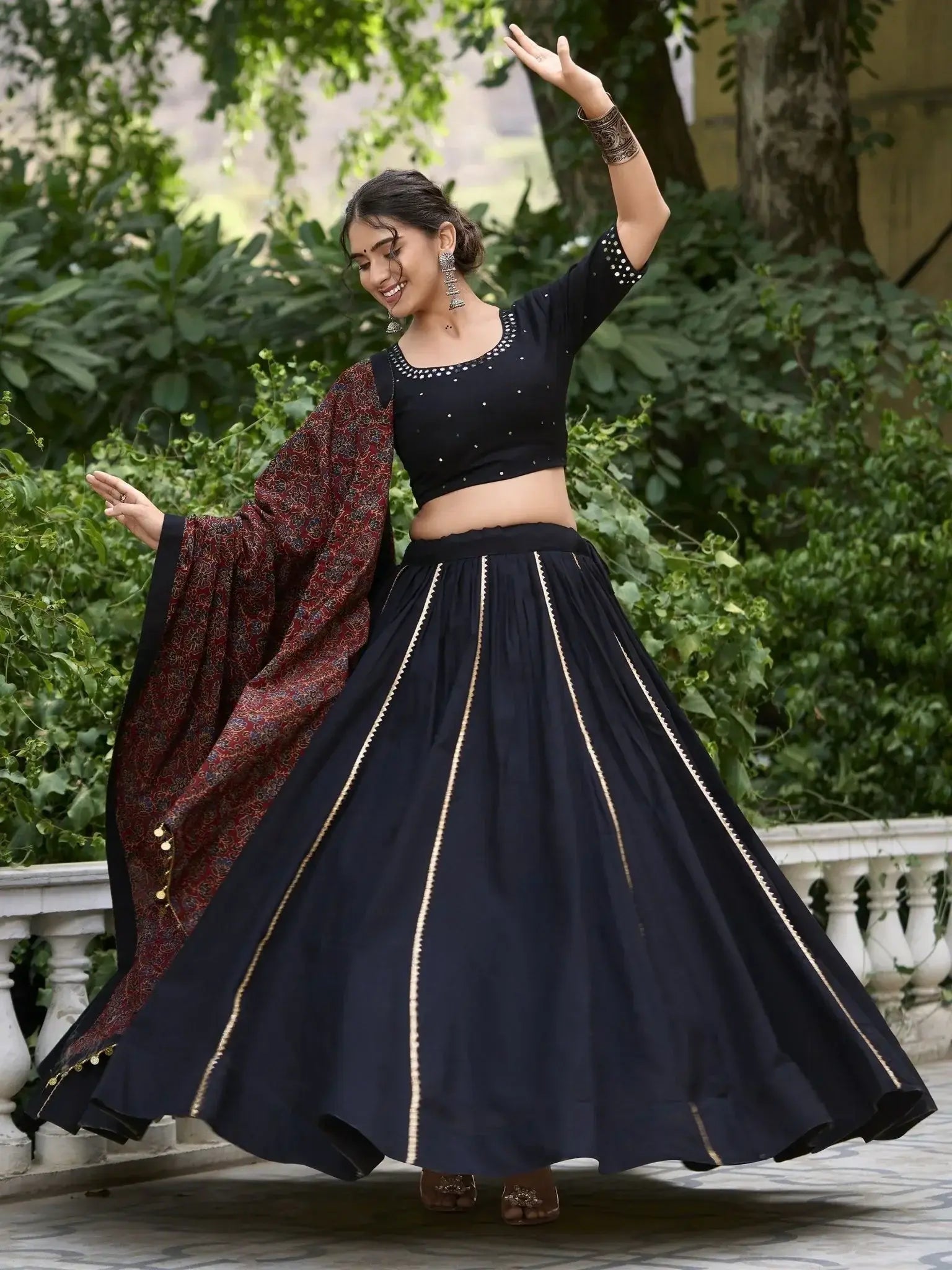 Navratri, a vibrant festival celebrating the divine feminine, is the perfect occasion to showcase your style and grace. Our stunning black lehenga choli brings together traditional aesthetics and modern flair, making it an ideal choice for the nine nights of celebration. Crafted from pure cotton, the stitched lehenga features a plain design complemented by exquisite gota patti touch-ups, ensuring you shine like a star during the festivities.