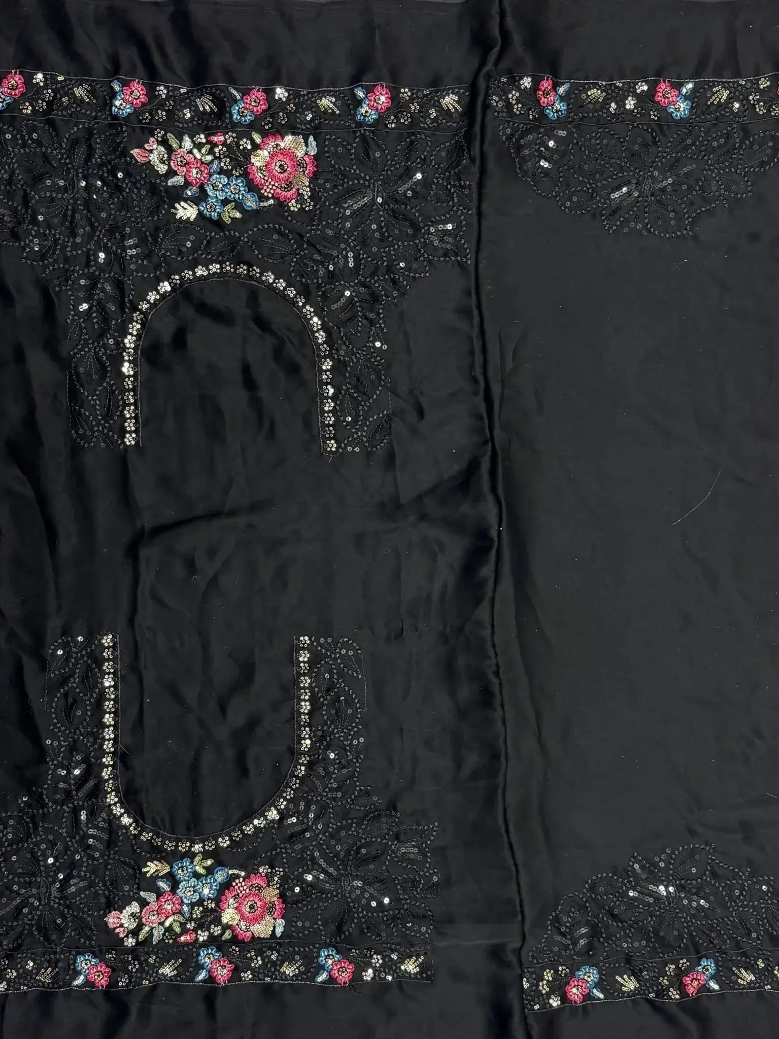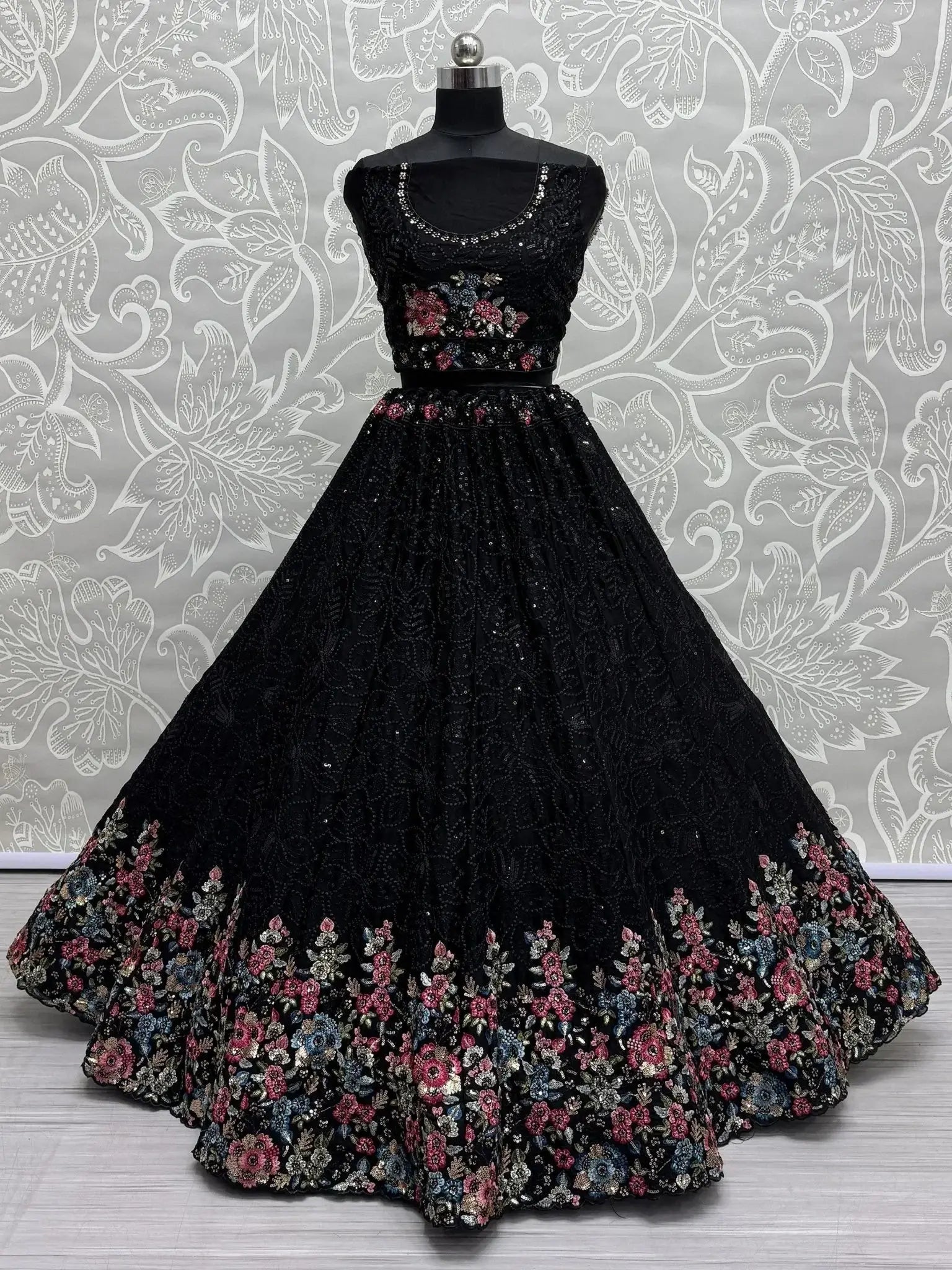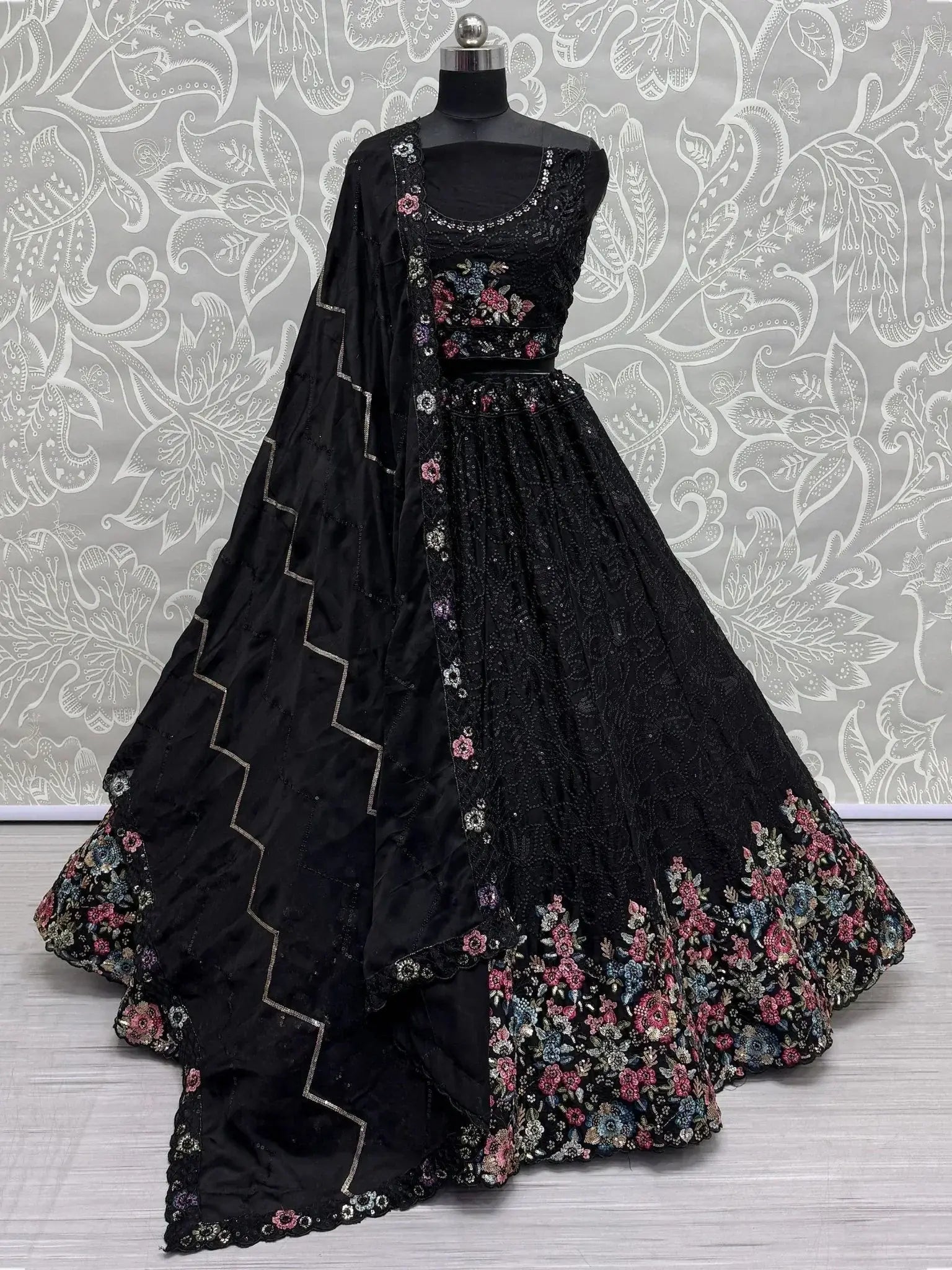 This exquisite set features a black color chinon lehenga adorned with sequin work, zari work, thread embroidery, and intricate floral embroidery. The matching chinon choli and dupatta also showcase the same stunning embellishments, creating a cohesive and luxurious look perfect for weddings and special occasions.
