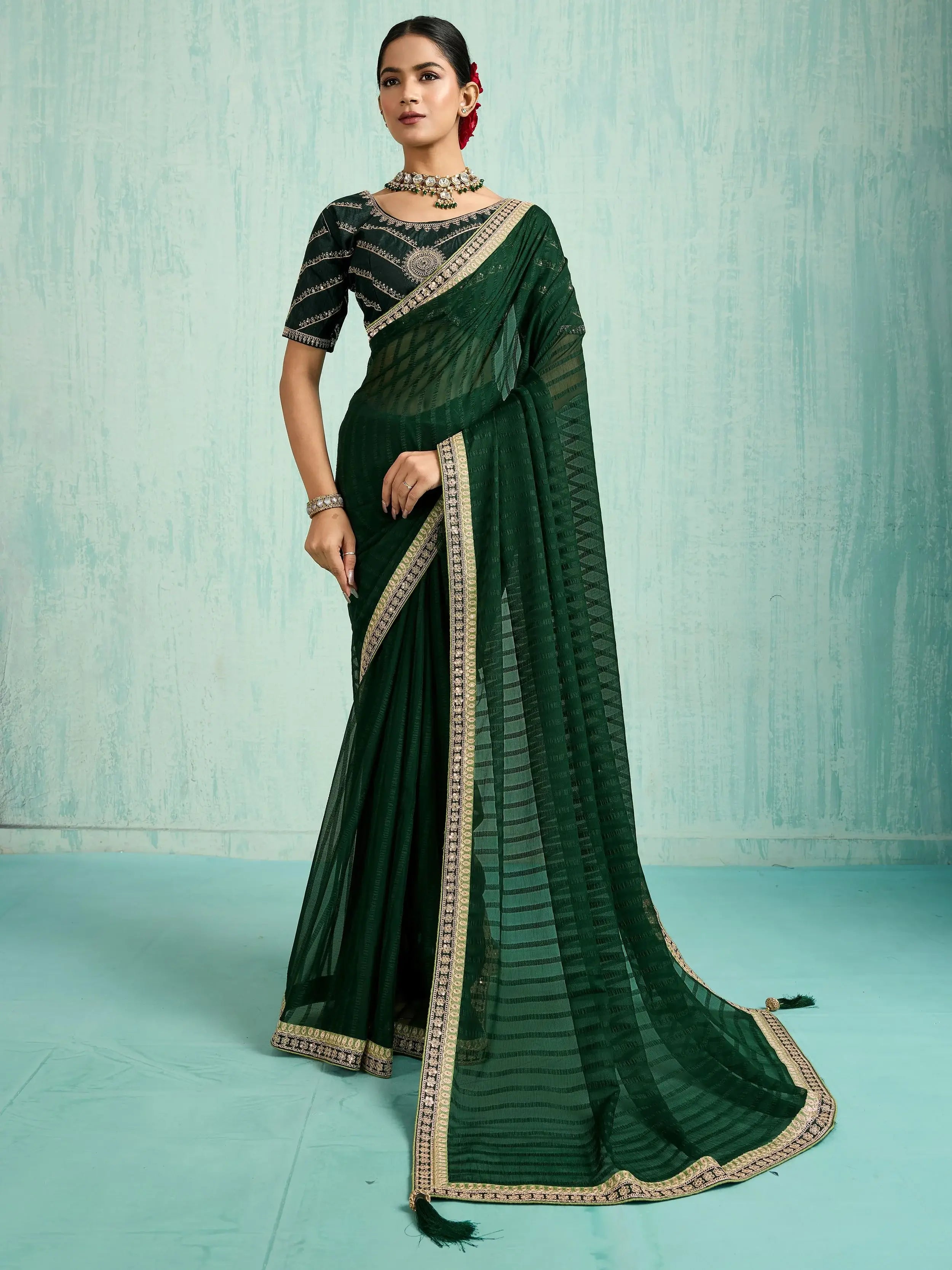 This elegant green saree is crafted from lightweight chiffon fabric, offering a graceful and flowy drape. It is beautifully highlighted with an embroidered border that adds a rich and traditional appeal.
