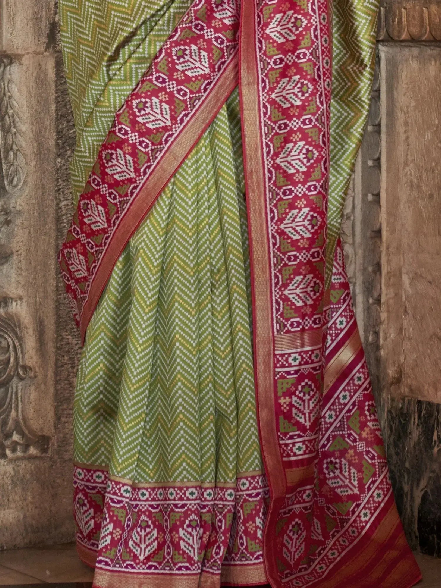 Additionally, the saree's vibrant green color is perfect for the festive season, adding a pop of color to your ensemble and setting you apart from the crowd. The intricate detailing of the patola print work further enhances the overall look of the saree, making it a timeless piece that you can cherish for years to come.