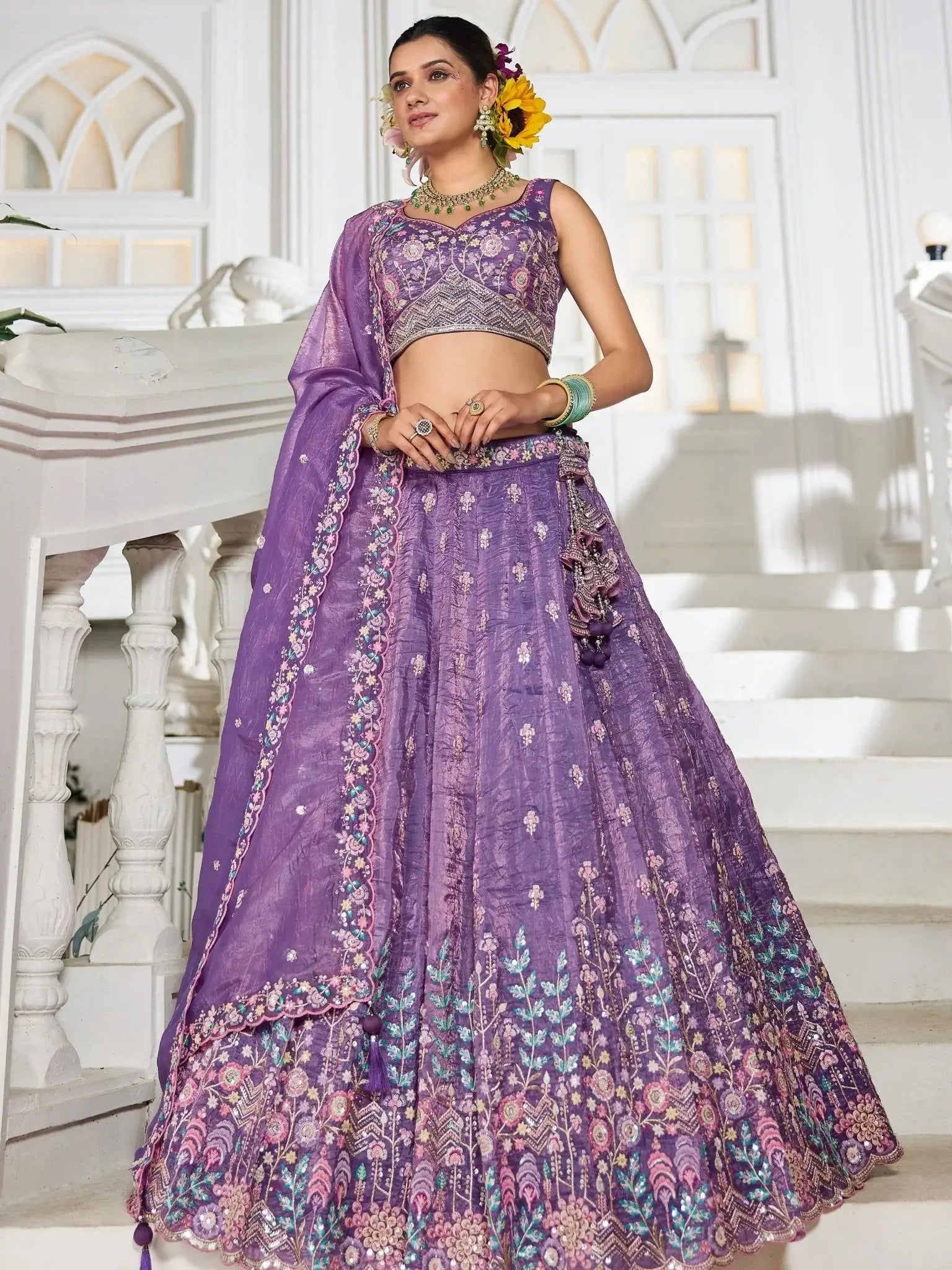 This purple tissue lehenga choli showcases intricate sequin and multicolor thread embroidery all over. The luxurious fabric reflects elegance and makes it perfect for festive celebrations.
