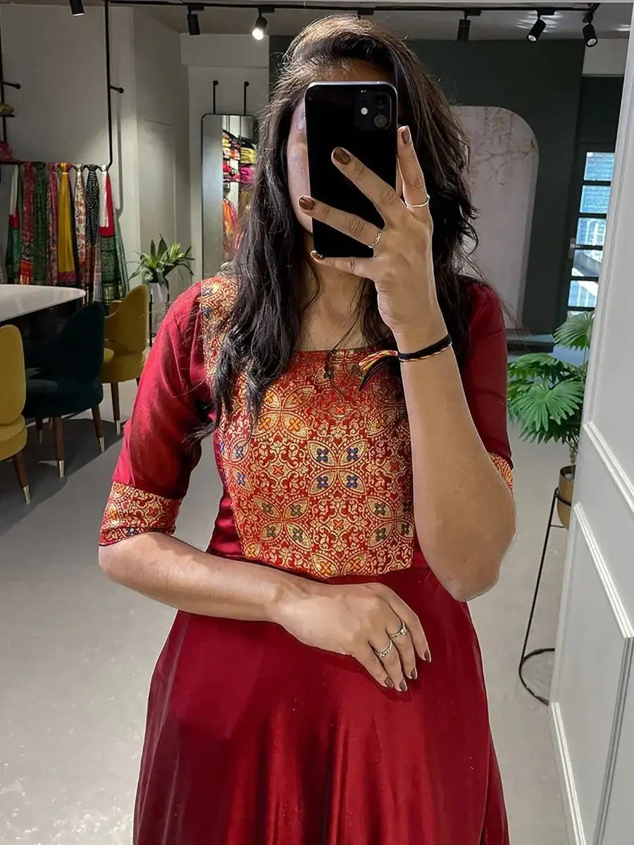 Dolled up this wedding season in maroon party gown with rangoli silk and weaved work having beautiful ethnic touch for any occasion.