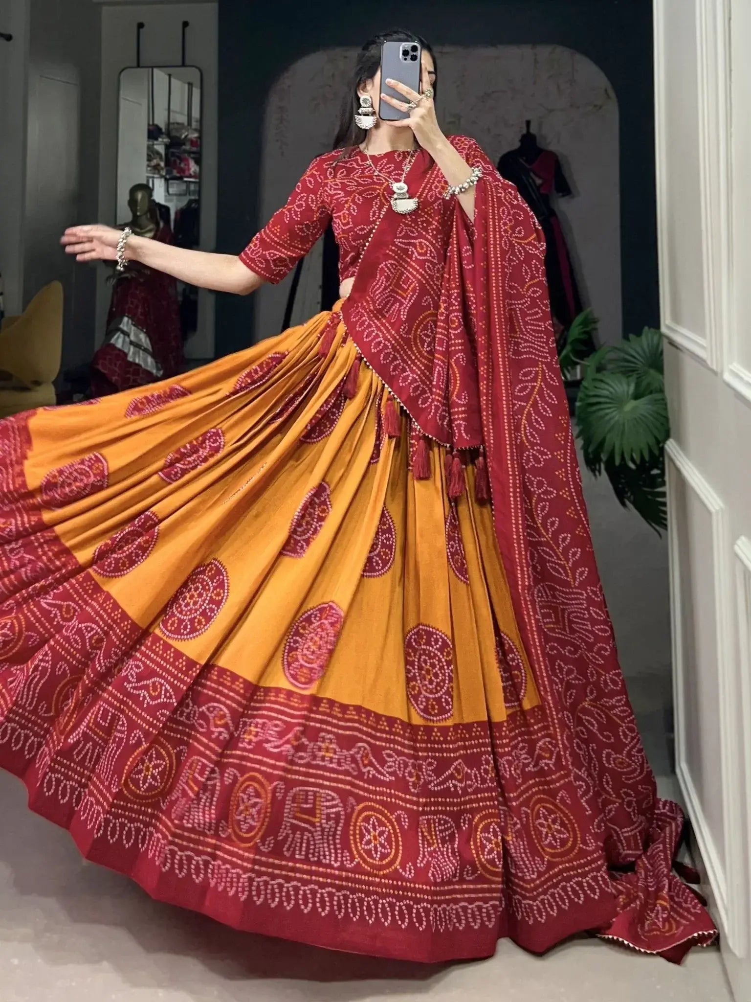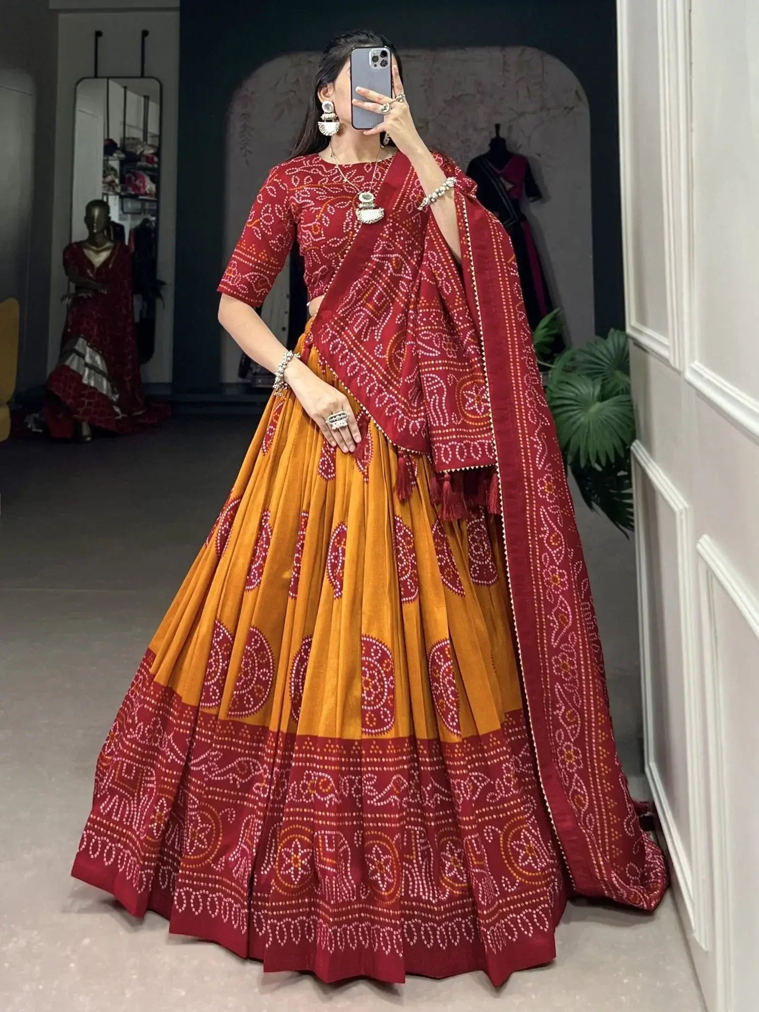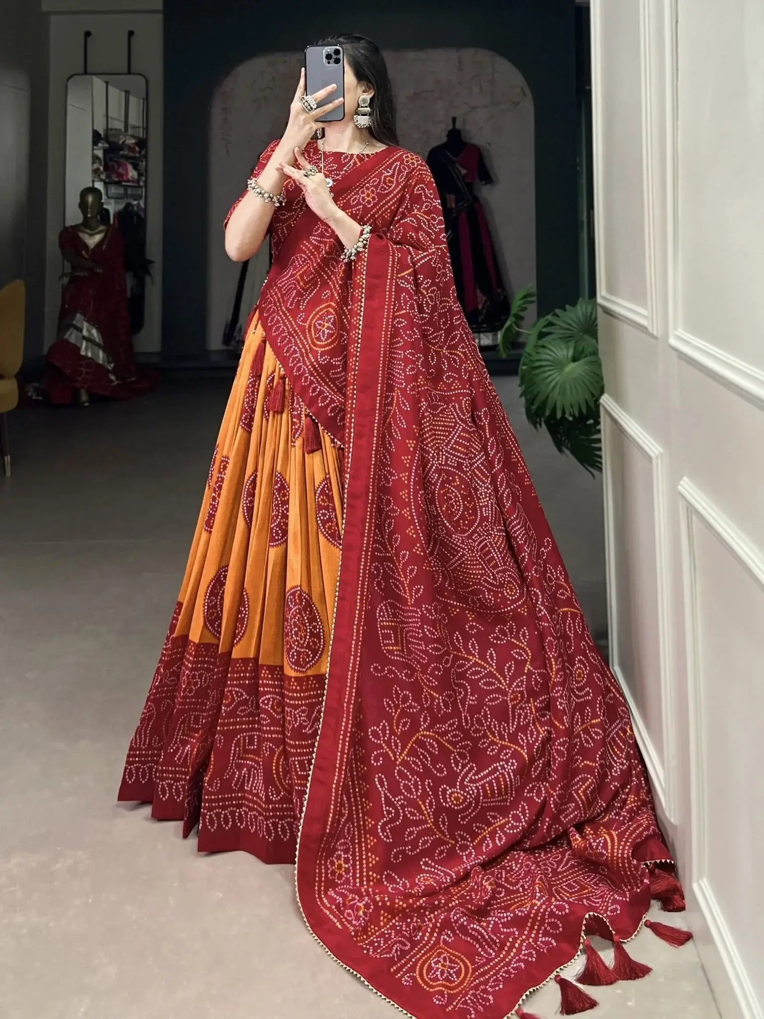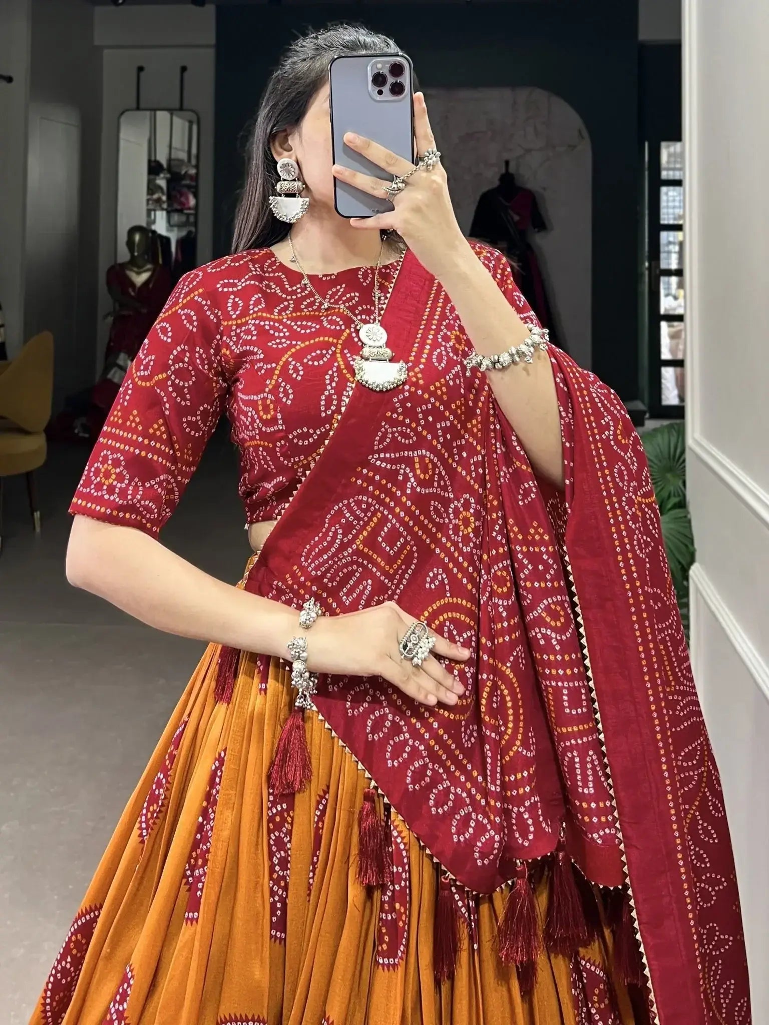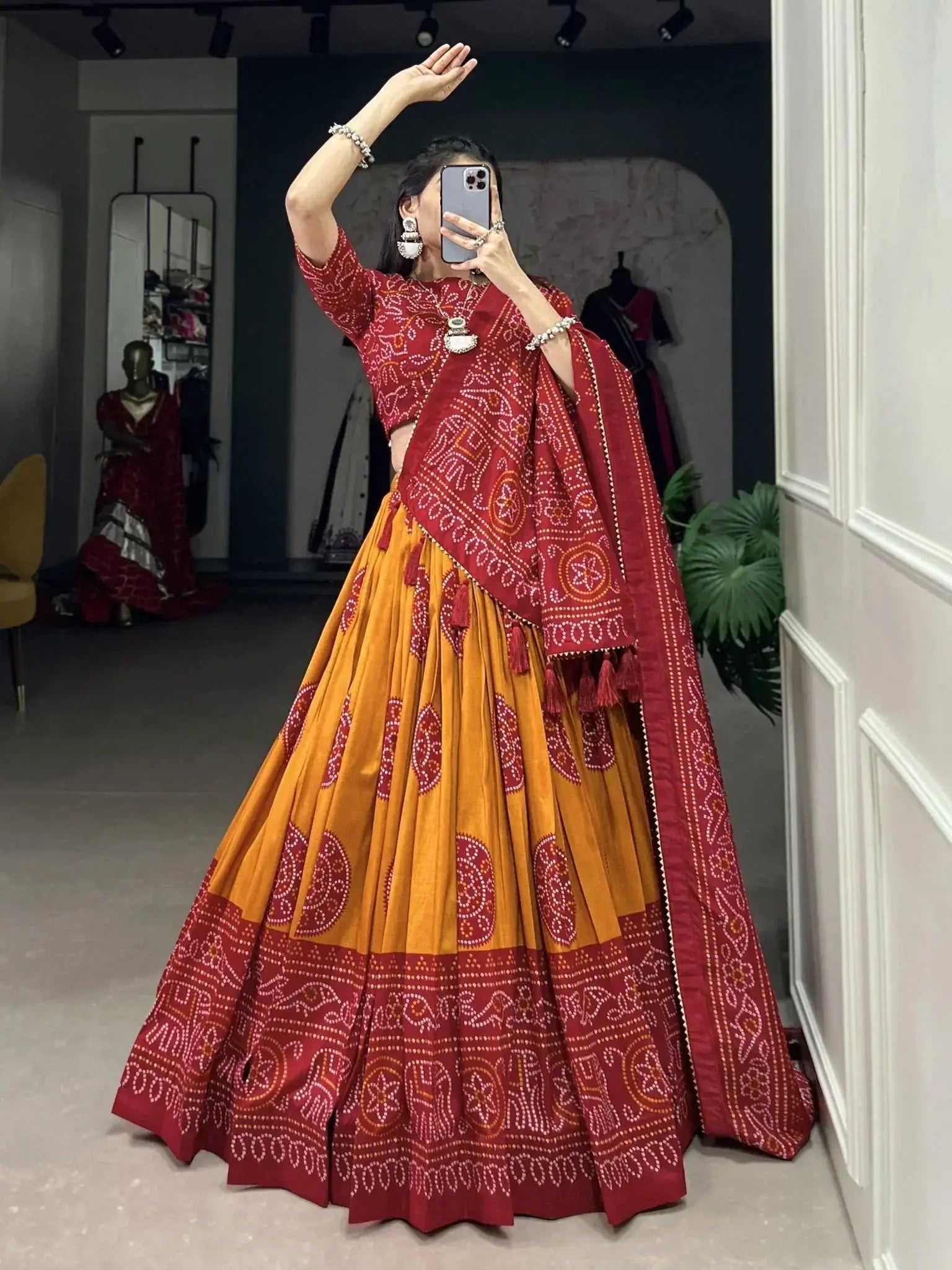 When it comes to traditional attire, few garments exude elegance and charm like a lehenga. The stunning red and mustard combination crafted from tussar silk is a beautiful representation of Indian craftsmanship and design. The lehenga features an exquisite bandhej print that adds a touch of sophistication, making it an ideal choice for festive occasions or weddings.