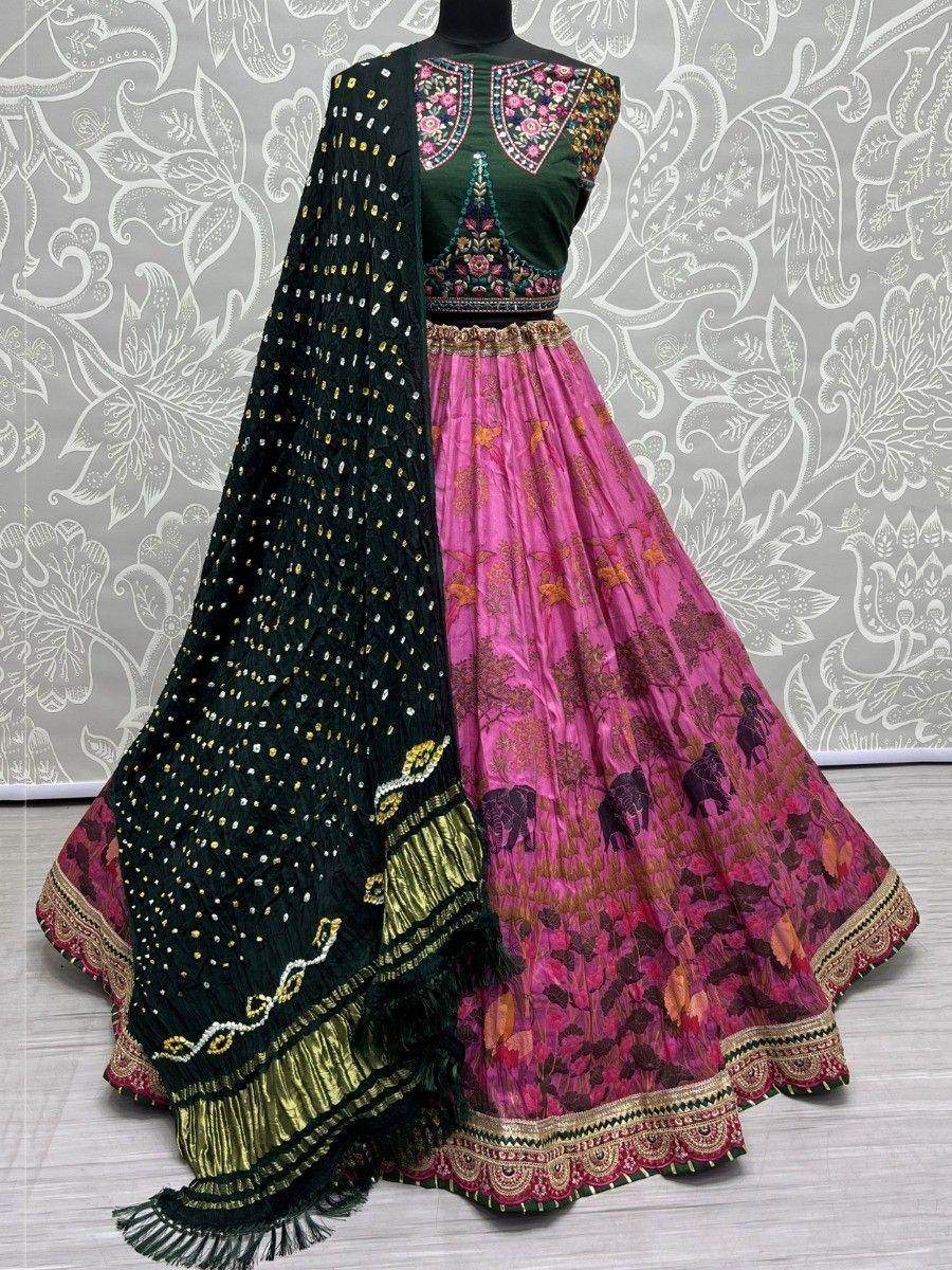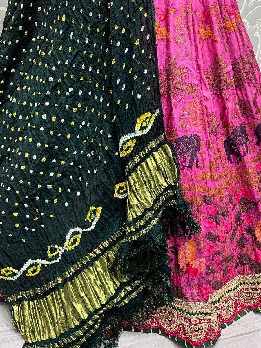 Accompanying the lehenga is a green-colored silk choli adorned with thread embroidered work, adding a contrasting element to the ensemble. The silk dupatta, also in green, features bandhani print work, completing the traditional yet contemporary look.