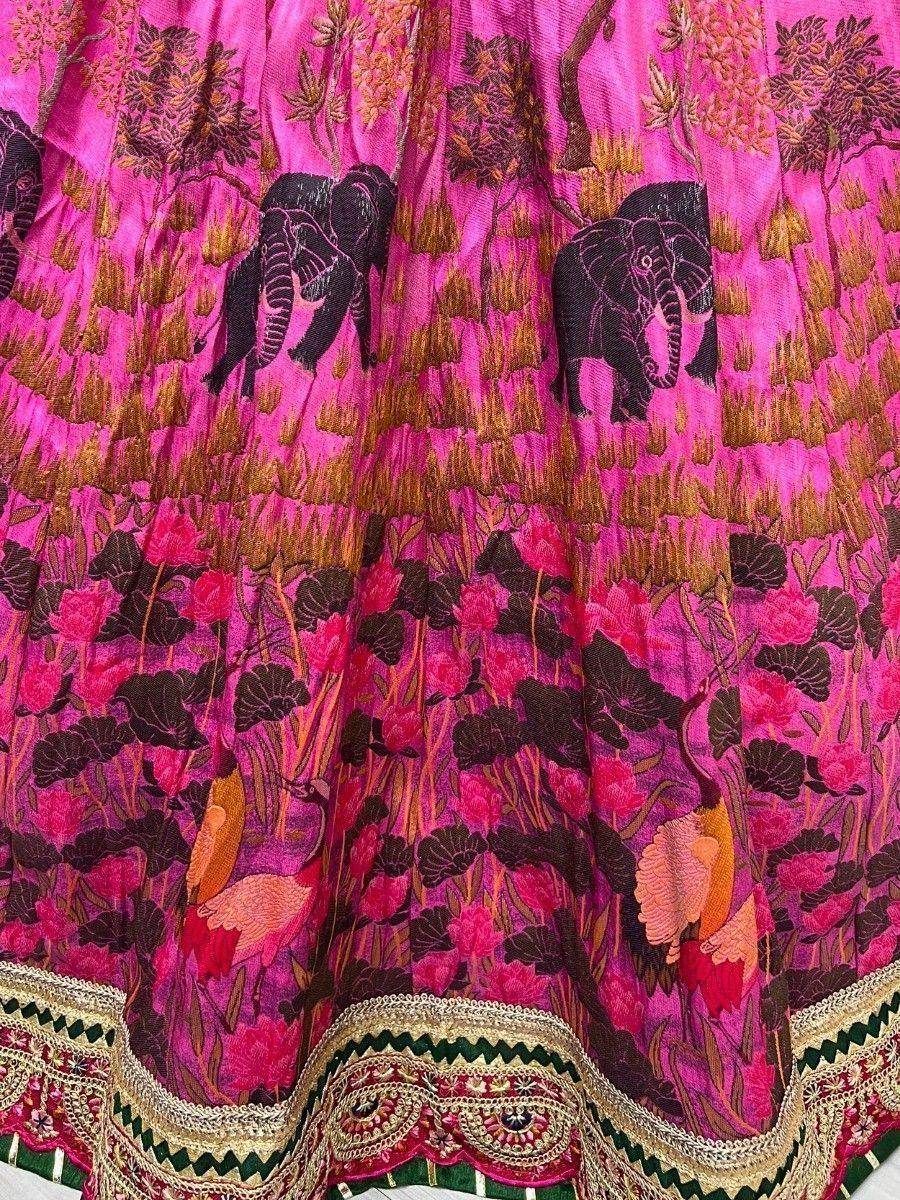 Made from high-quality silk material, the lehenga features a stunning pink color with a heavy digital print work that adds a touch of opulence and sophistication. The intricate details and exquisite craftsmanship are evident in the fancy embroidered lace work, which elevates the overall aesthetic of the lehenga.