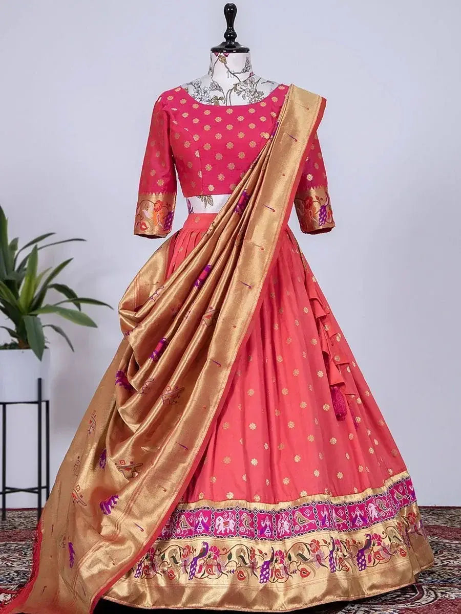 Adorn your vogue in cocktail of two indian textile paithani and patola silk lehenga in pink hue with patola and paithani border with peacock , elephant and parrot motifs and buttis also has handmade fabric tessels.