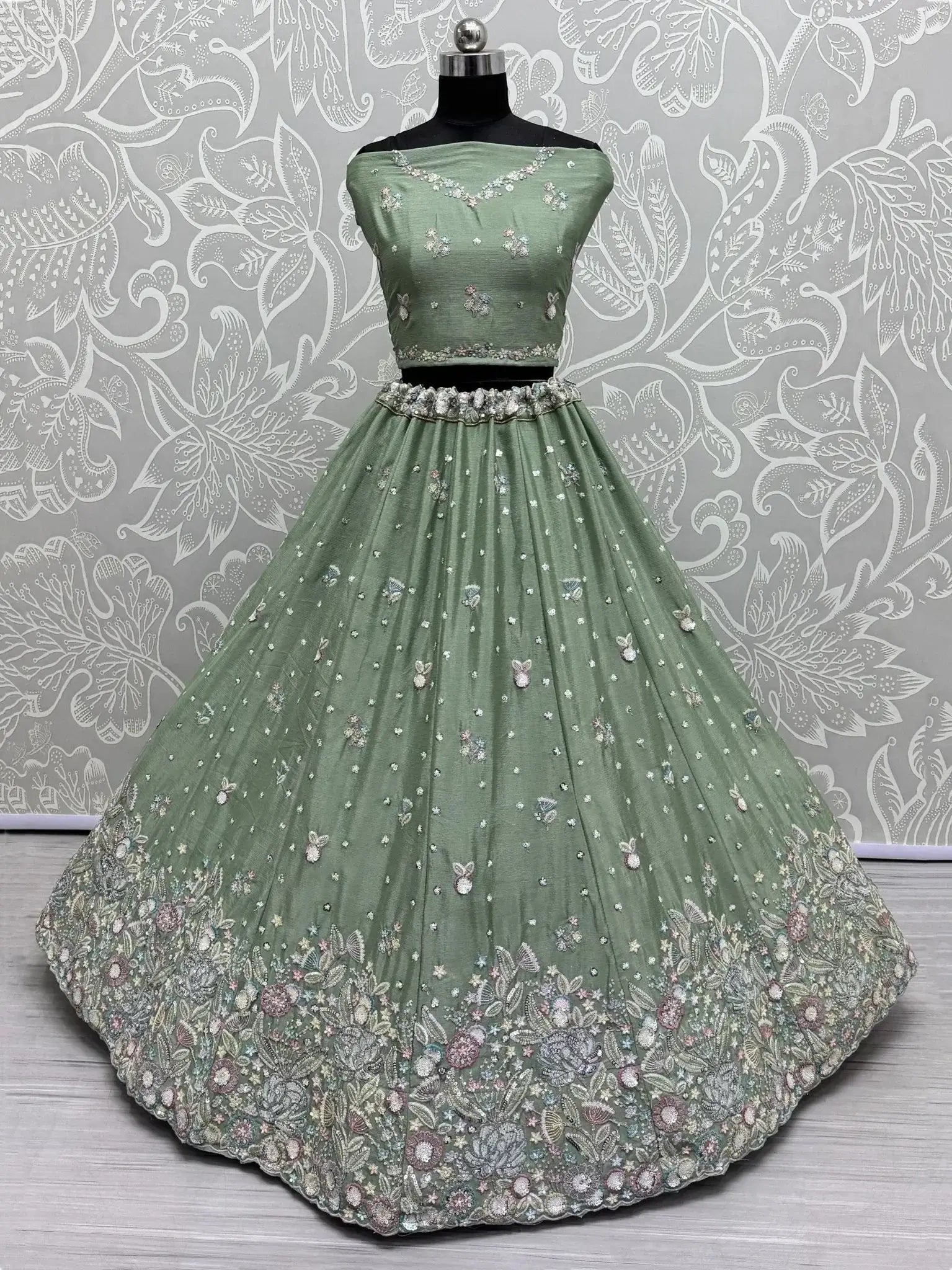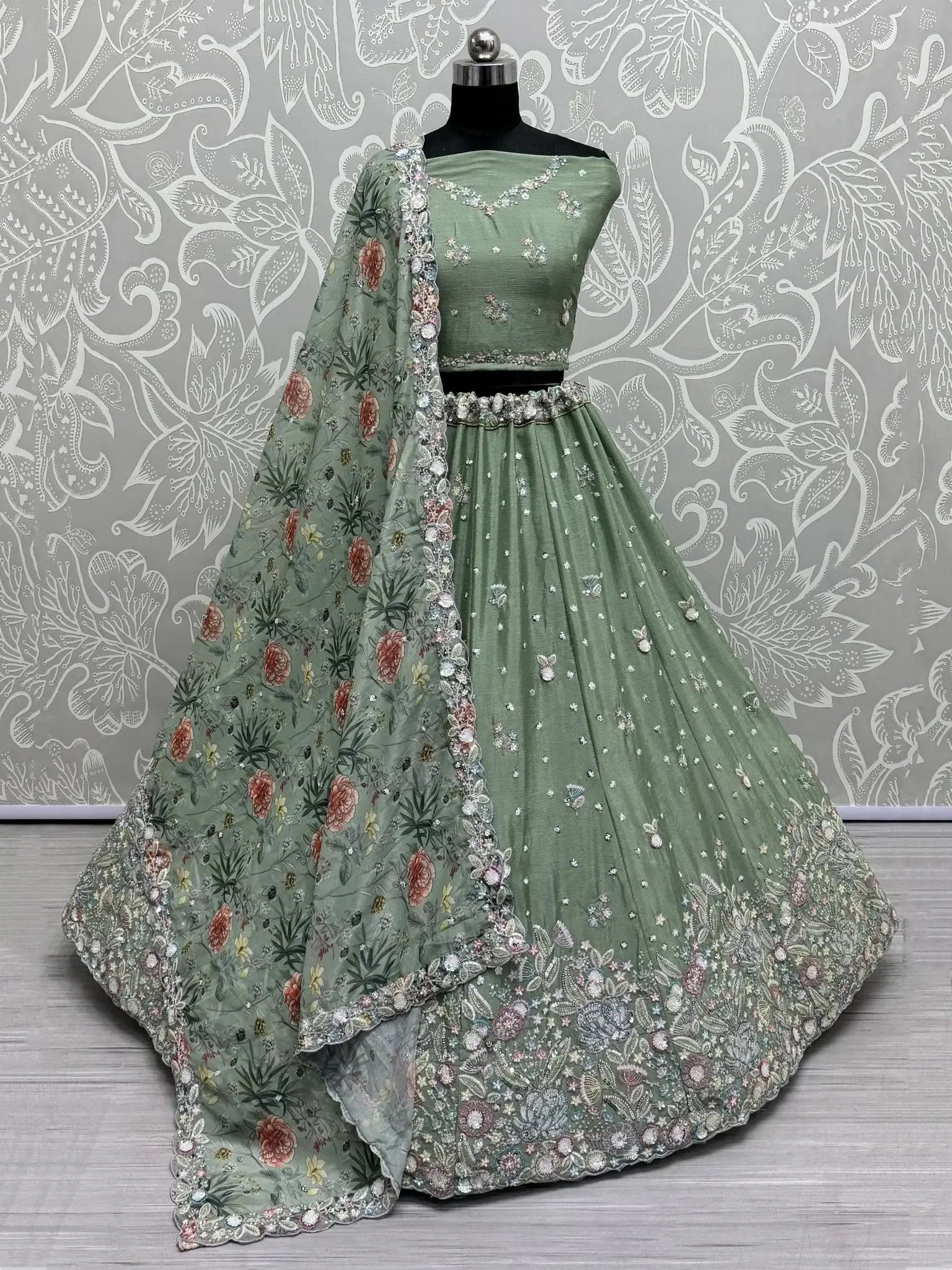 This stunning ensemble features a pista green color chinon lehenga with intricate sequin work and thread embroidered work, along with a matching chinon choli and dupatta. The lehenga is semi-stitched up to 42 inches, providing a comfortable and flattering fit for any body type.