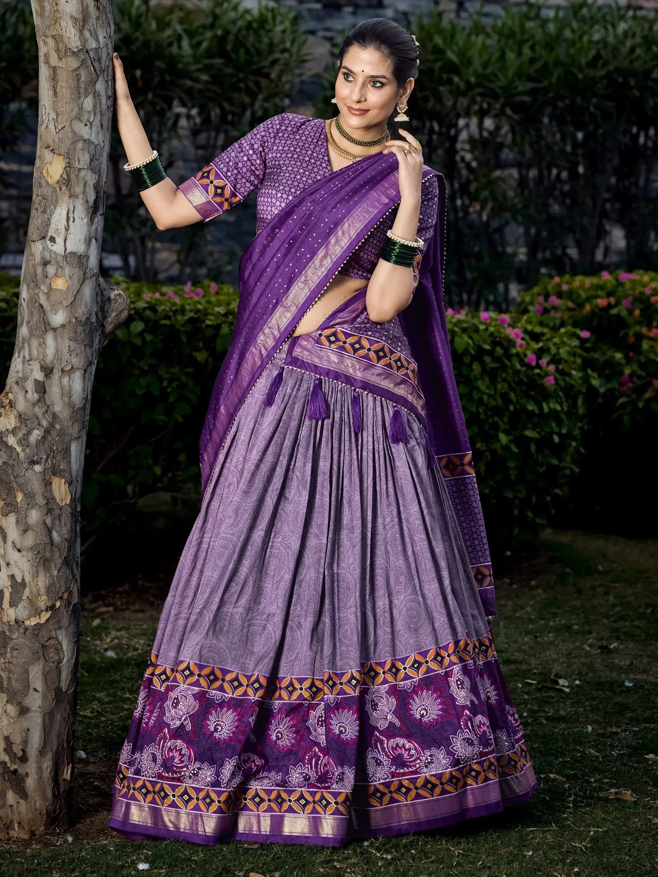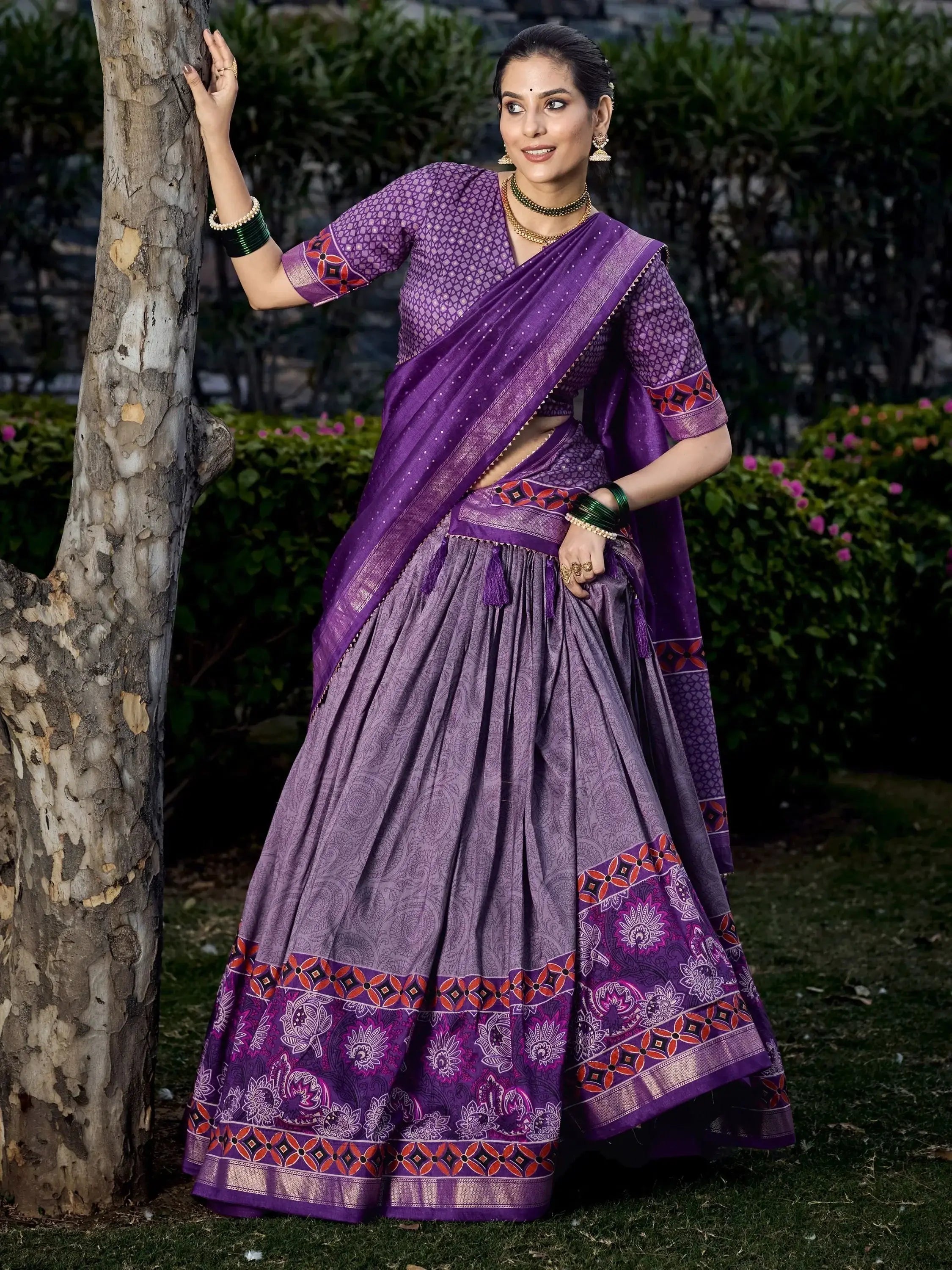 Indulge in the enchanting allure of royalty with this magnificent purple tussar silk lehenga choli ensemble, adorned with exquisite digital print and foil work. The regal hue of purple exudes sophistication and charm, making it a perfect choice for a myriad of occasions, from grand weddings to festive celebrations. Crafted with precision, the lehenga boasts a generous flair of 3.80 meters, ensuring fluid movements that will captivate all eyes wherever you go.