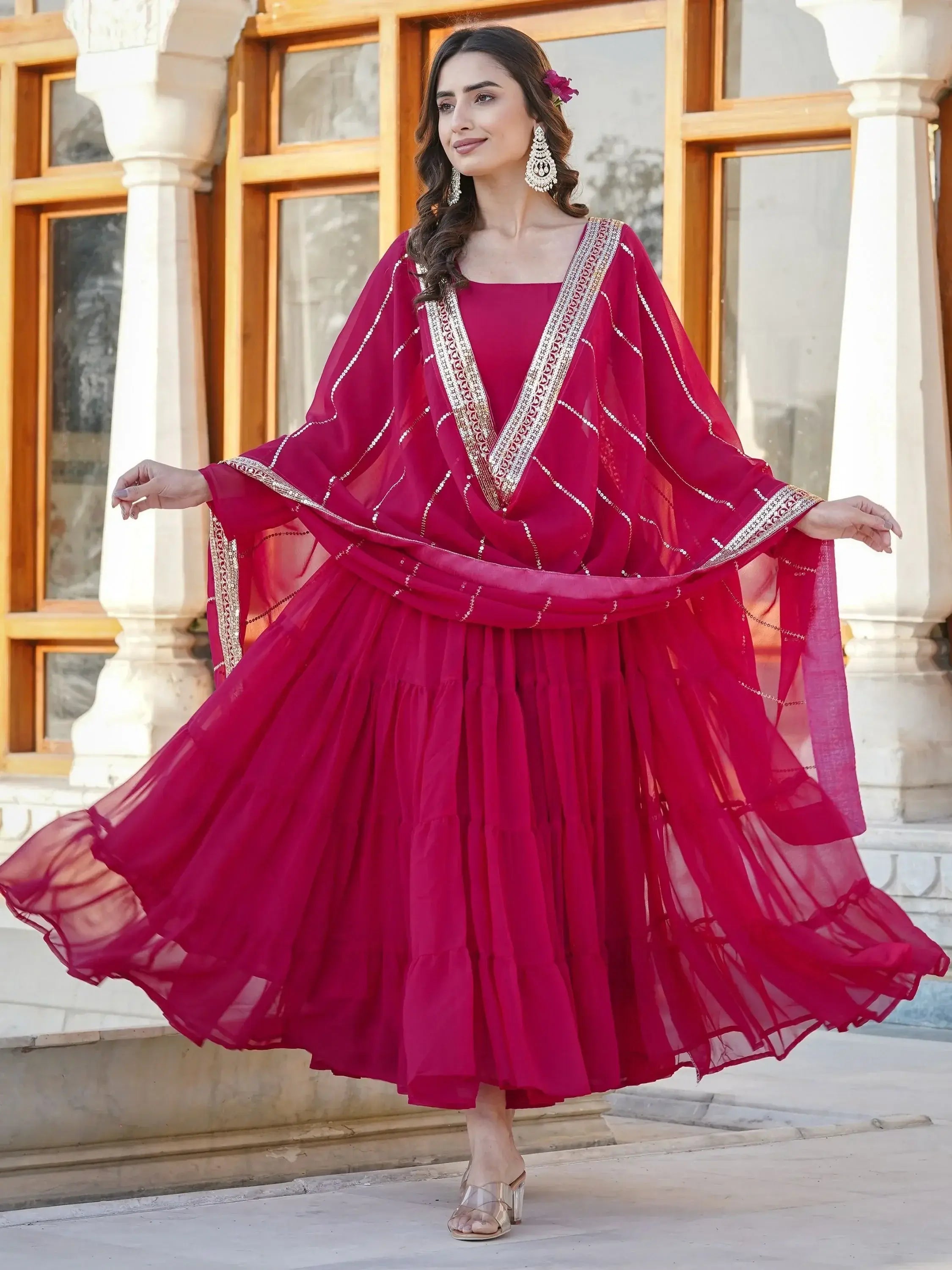 Elevate your traditional style with our alluring rani pink georgette traditional plain gown with a dupatta. This stunning gown is crafted from high-quality georgette material in a beautiful rani pink color, making it perfect for any festive occasion or event. The gown comes fully stitched and is available in sizes ranging from XS to XXL, ensuring a comfortable and flattering fit for all body types.