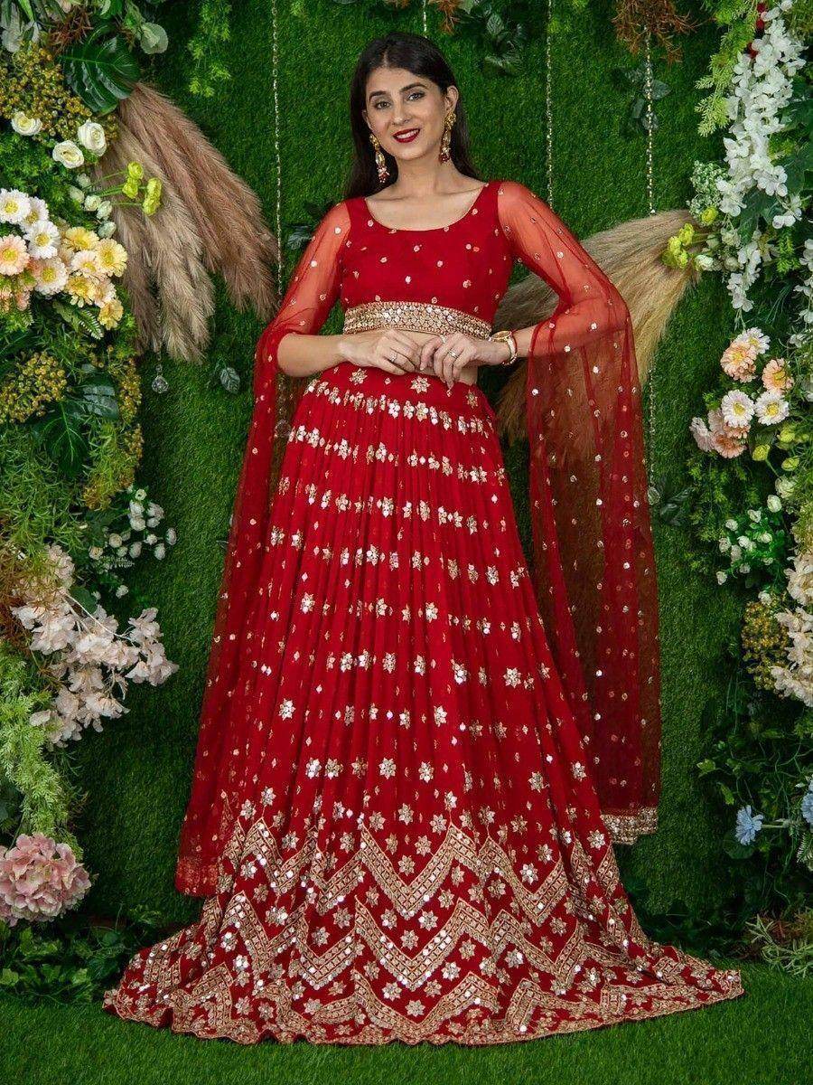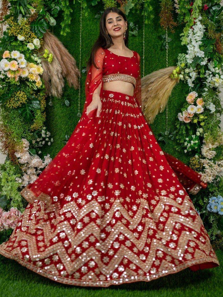 Introducing the alluring red sequins georgette lehenga choli with attached dupatta, a magnificent outfit that exudes elegance and charm. Crafted with meticulous attention to detail, this mesmerizing red lehenga choli is designed to make you stand out on any special occasion.