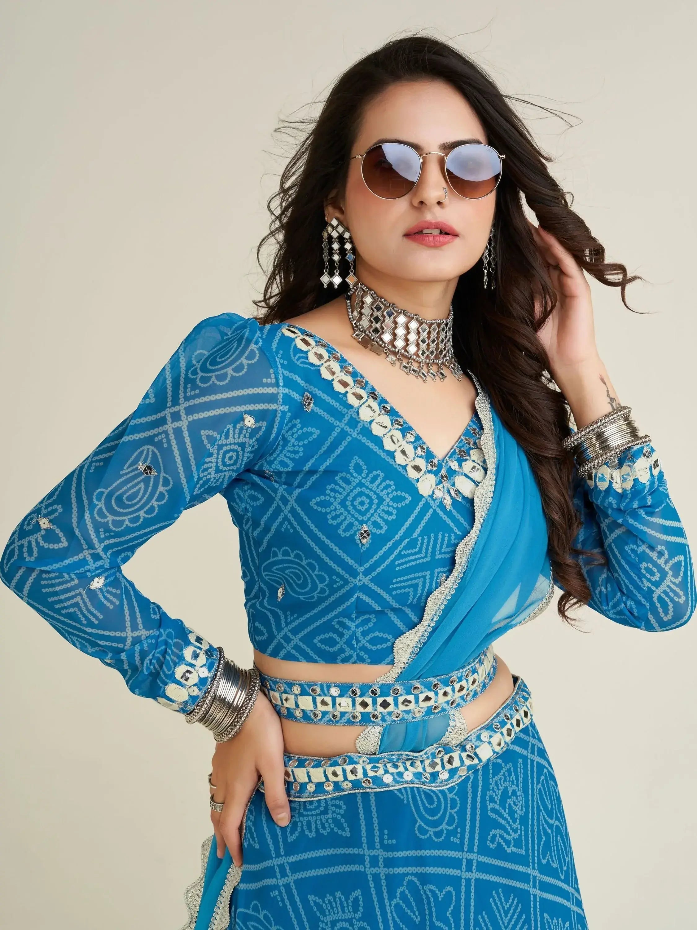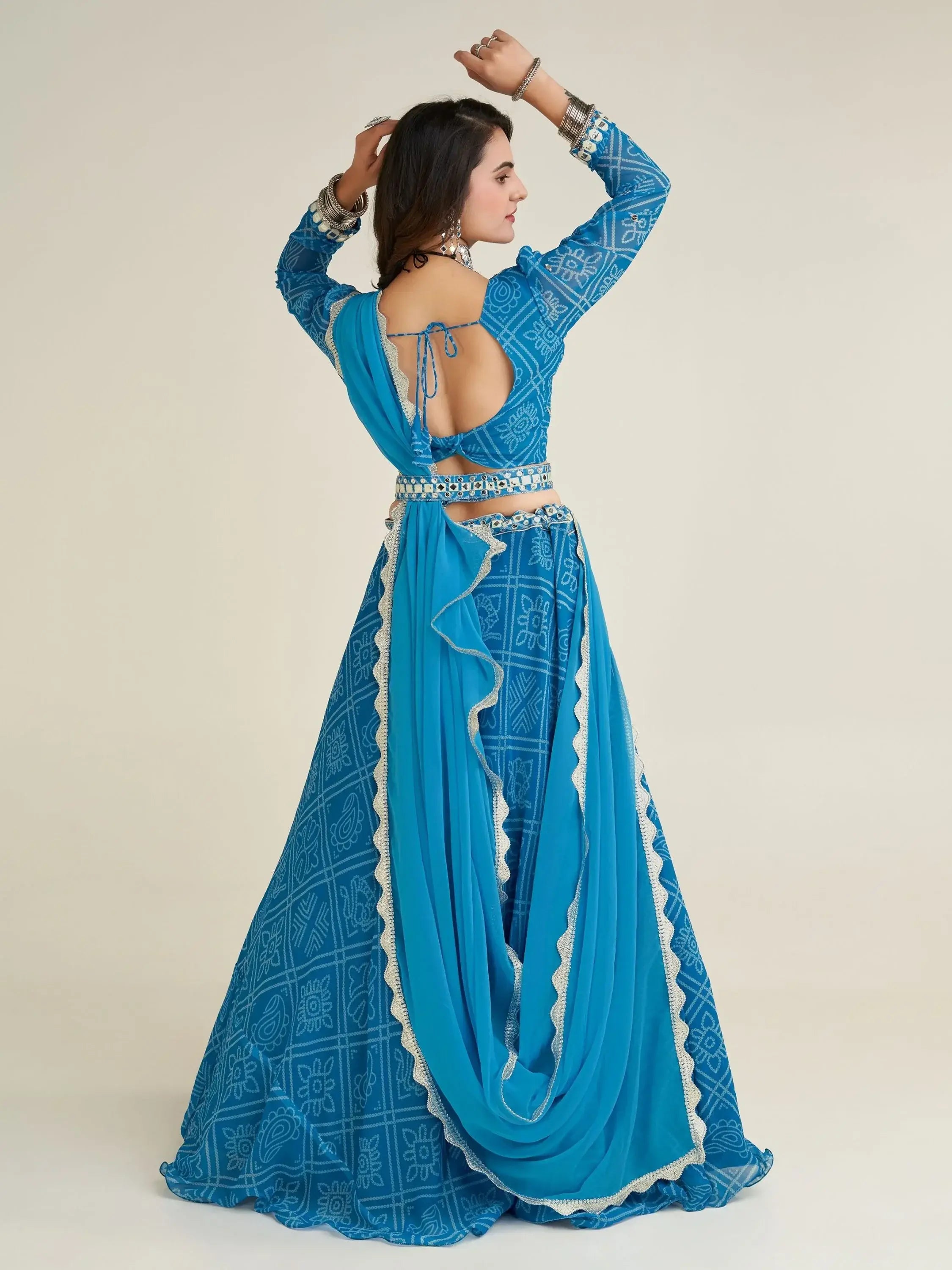 This lehenga choli set is its versatility. It can be dressed up for a festive look or paired with elegant accessories for a more formal occasion. The sky-blue color is flattering on all skin tones and the bandhani print adds a touch of traditional charm. The georgette fabric is lightweight and flowy, making it comfortable to wear for long hours.