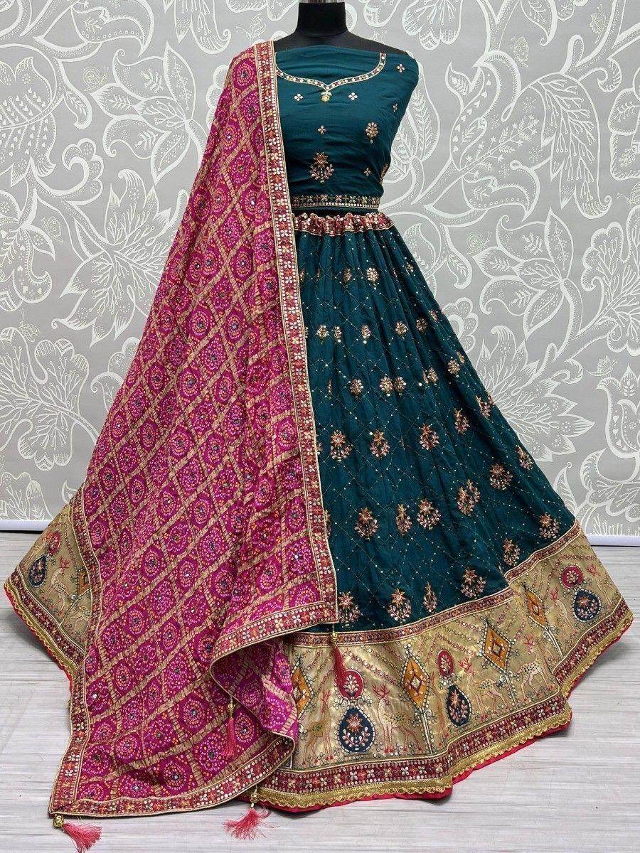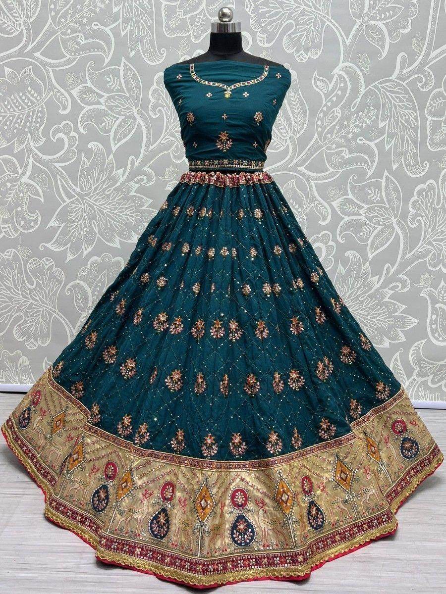 Introducing our alluring teal blue sequins silk sangeet wears lehenga choli with dupatta, a stunning and captivating ensemble crafted with love and pride for the beautiful you. This exquisite wedding lehenga is made from high-quality teal blue gadhawal silk material, ensuring a luxurious and comfortable feel.