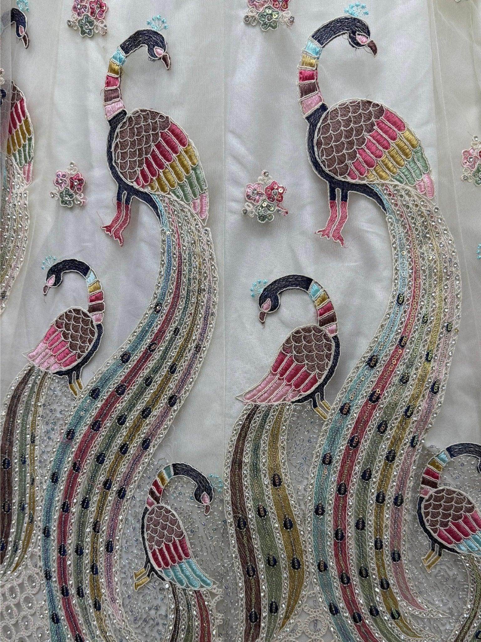 Adorned with intricate peacock patterns, dori work, and multi-thread embroidery, this lehenga blends tradition with a touch of whimsy. The detailed craftsmanship adds rich texture, while the shimmering zircon diamond embellishments bring just the right amount of sparkle.