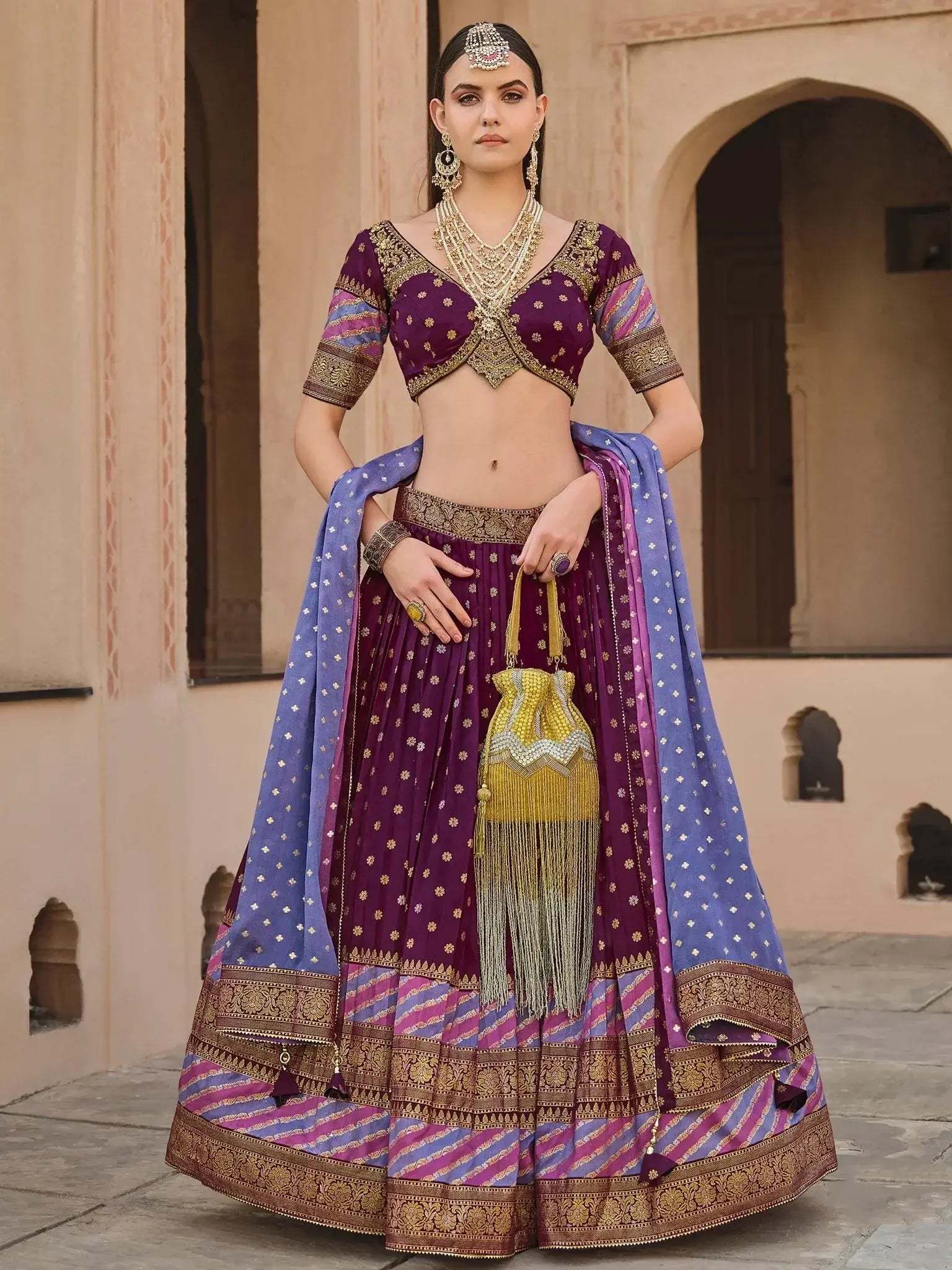 This exquisite wine lehenga features intricate foil print work that adds a touch of elegance and sophistication to the outfit. The matching silk choli is adorned with zari embroidered work, foil print, beads work, and sequin work, making it truly a masterpiece of craftsmanship.