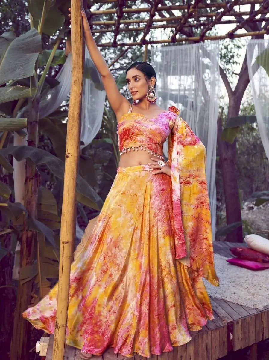 Introducing our latest design, the Alluring Yellow Shibori Printed Silk Indo Western Crop Top Lehenga! This beautiful and unique outfit is perfect for any occasion, whether it be a party, event, festival, engagement, or wedding.