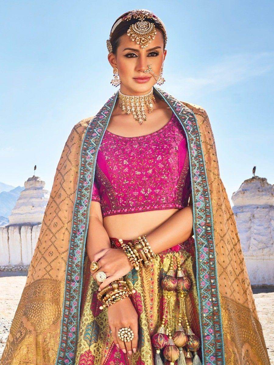 Accompanying the lehenga is a pink color viscose silk material choli, adorned with sequin and thread embroidery work. To complete the look, we have included a beige color viscose silk dupatta with zari weaving work.