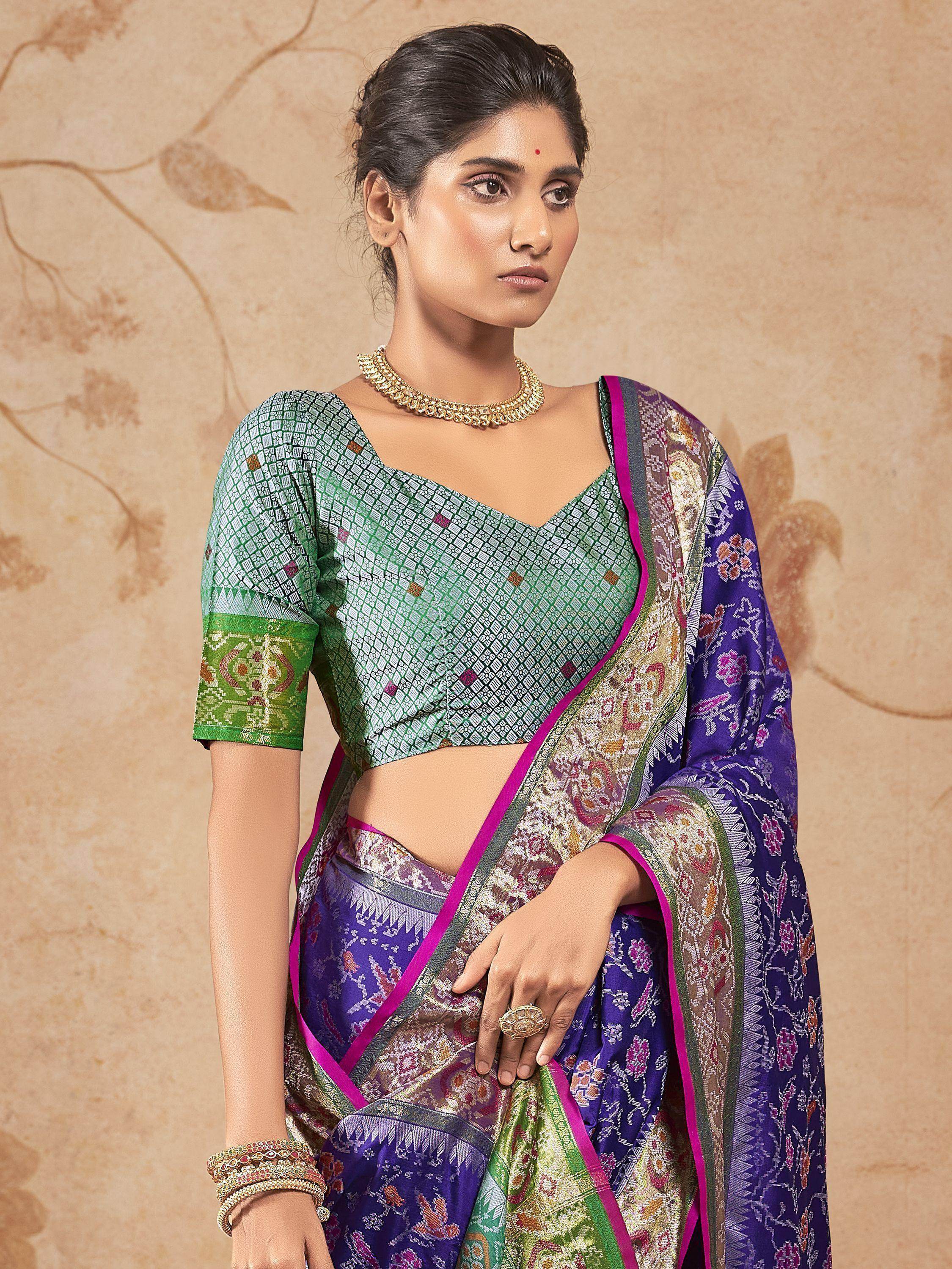 Elevate your ethnic wear collection with this stunning blue zari-weaving patola silk saree with a matching green blouse. Perfect for festivals, events, and special occasions, this saree exudes elegance and grace. The intricate zari weaving work adds a touch of sophistication, making you stand out in the crowd.