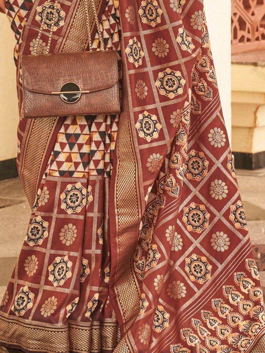 The brown silk saree with digital print work and zari weaving work is a versatile piece that can be worn at weddings, festivals, and other special occasions. Its timeless design and rich color make it a wardrobe staple that can be passed down through generations. The silk fabric adds a touch of luxury and comfort, allowing you to feel confident and beautiful throughout the day.