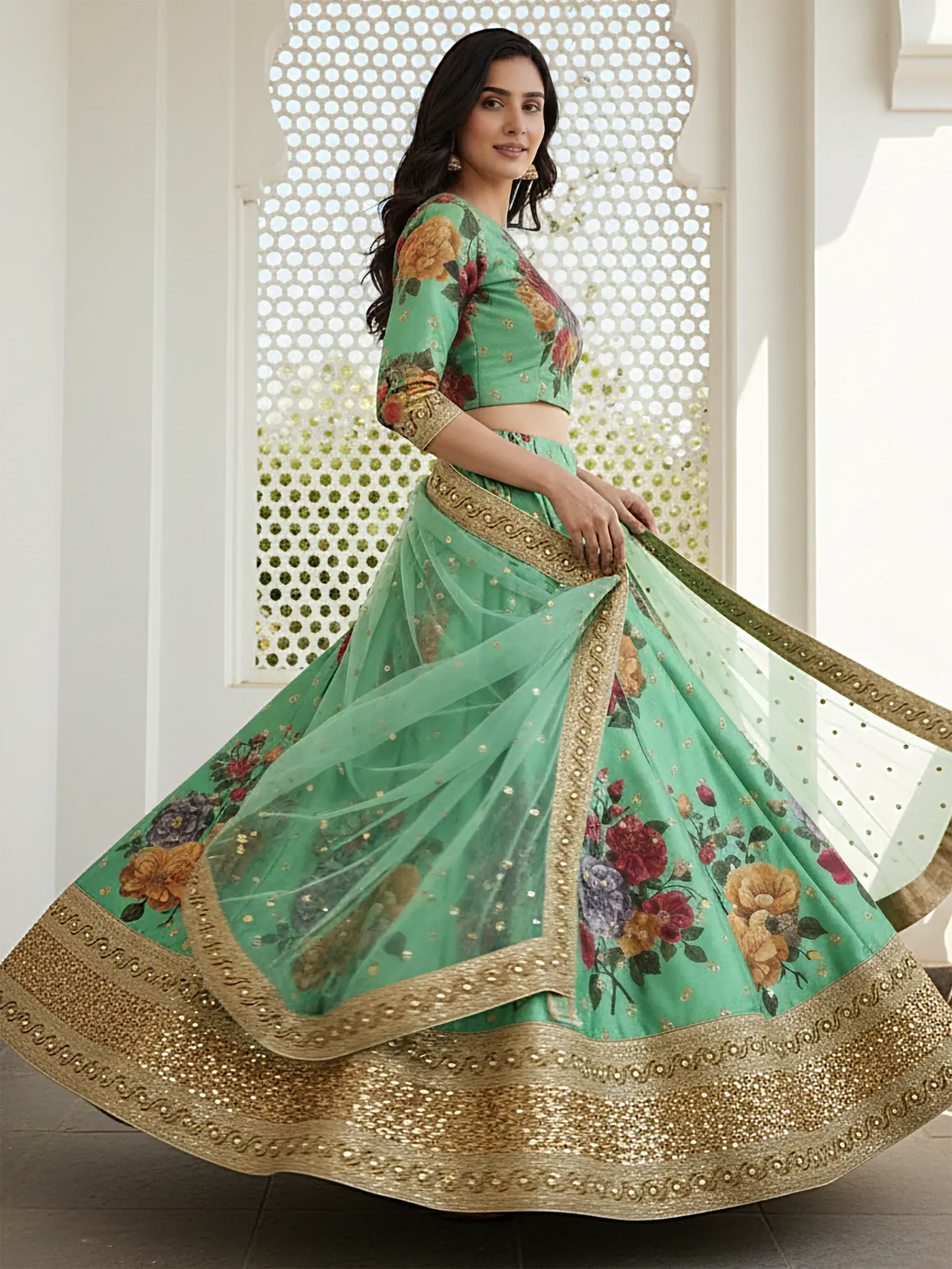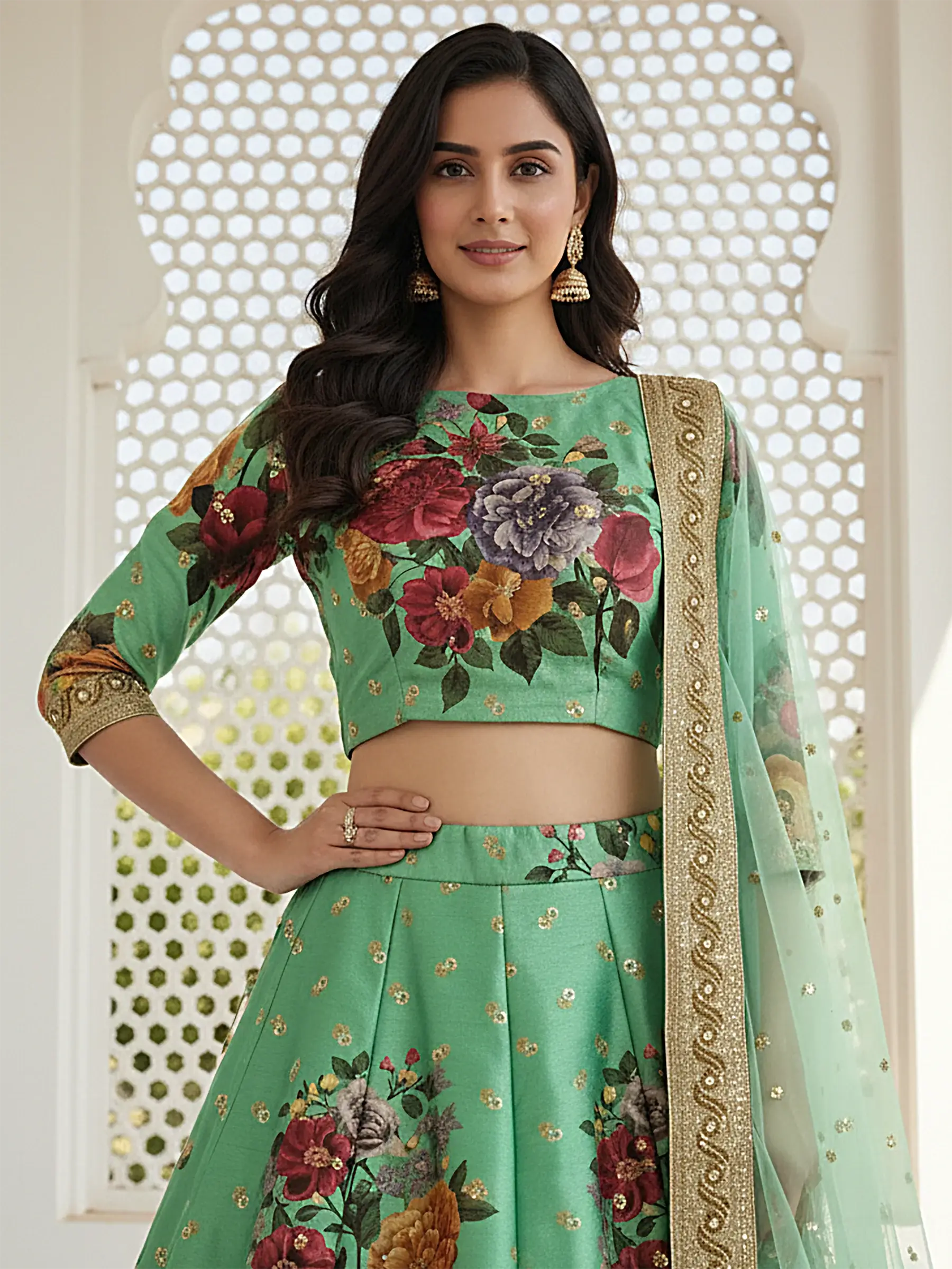 This beautiful semi-stitched lehenga set is crafted in a refreshing mint green shade, adorned with bold floral prints in shades of red, yellow, and purple. The silk fabric base is enhanced with delicate golden butti work that adds a subtle shimmer to the outfit.