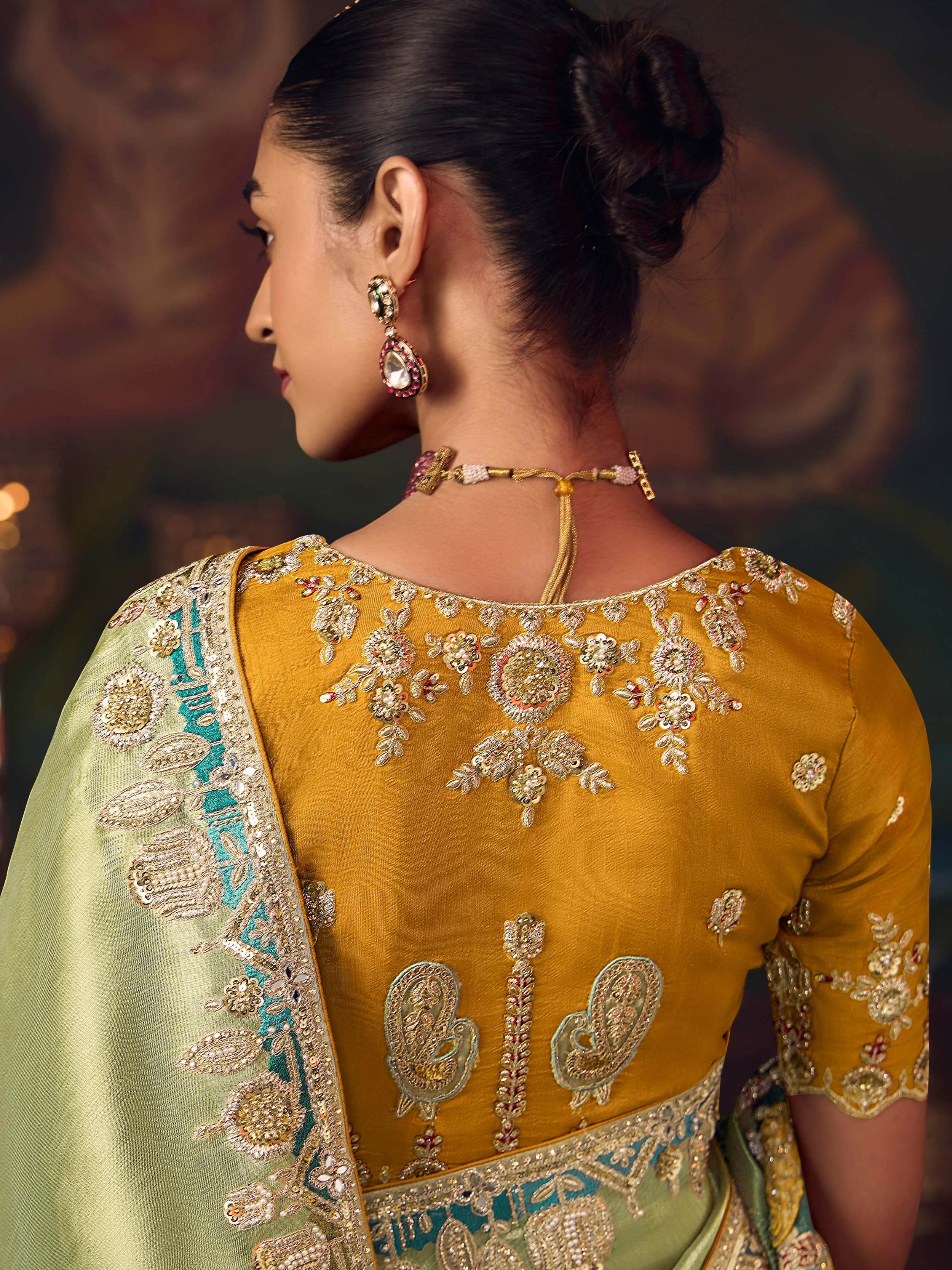 The saree comes in a soft green shade made from pure silk, giving it a rich and smooth look. It features detailed embroidery along the border, adding sparkle and elegance.