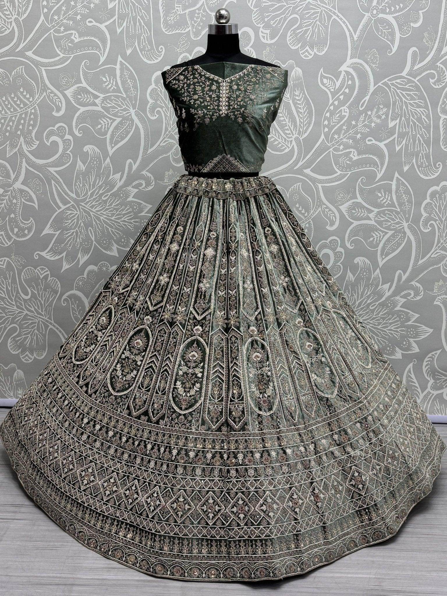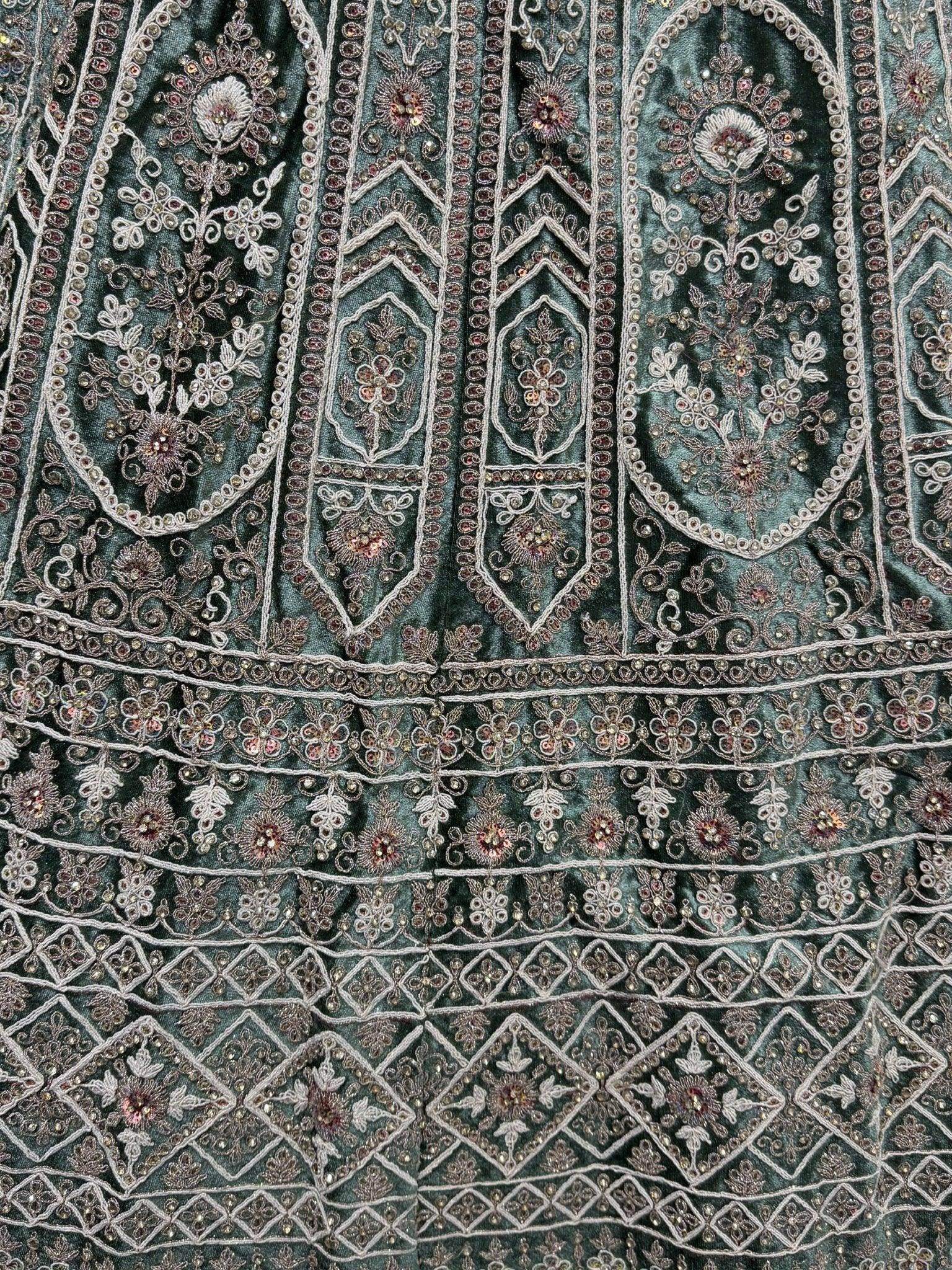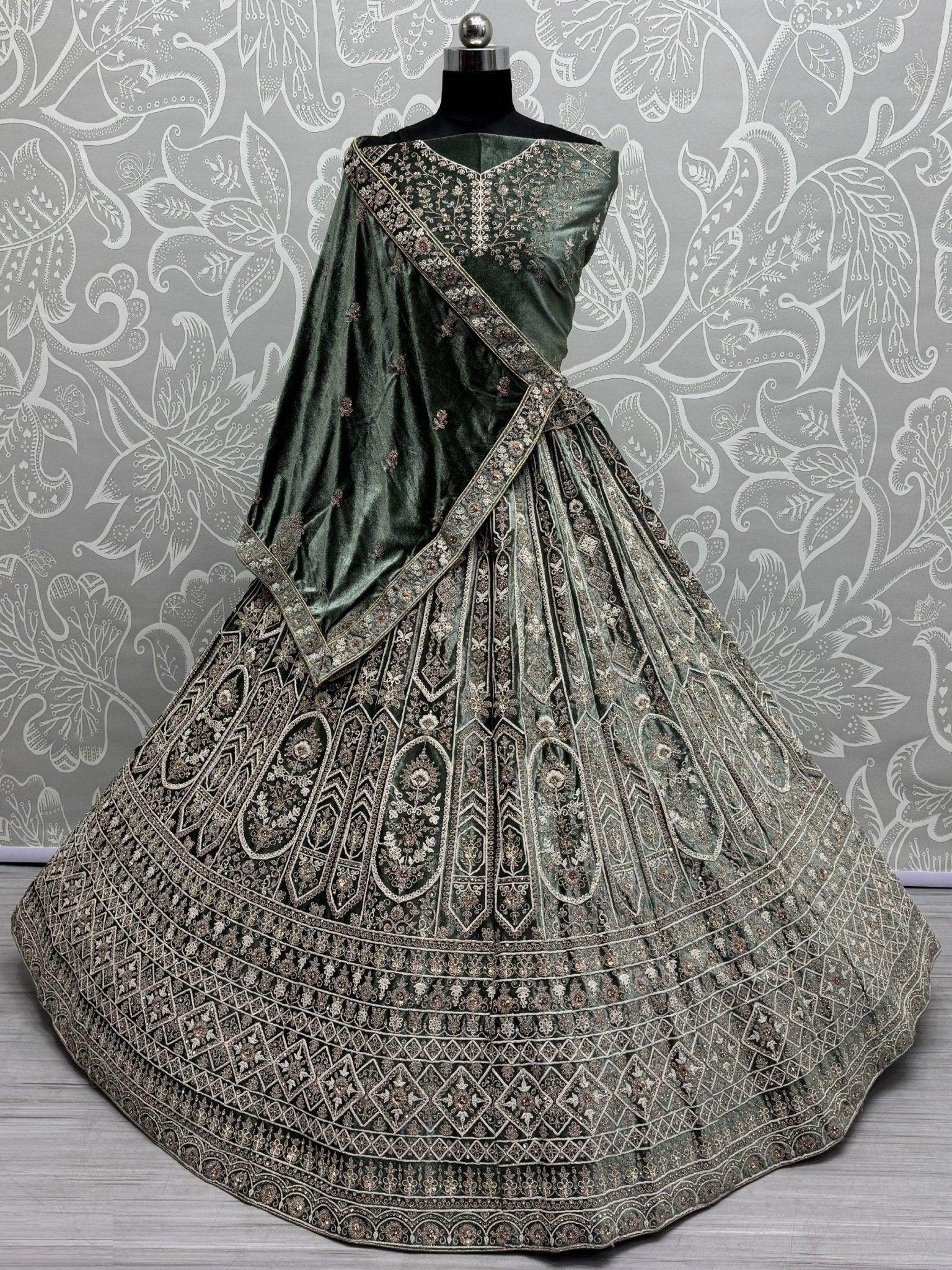 Make a majestic entrance on your special day with this amazing green velvet bridal lehenga choli, crafted to reflect regal elegance. The lehenga is adorned with delicate dori embroidery, zari and multi-thread work, and enriched further with fancy pattern patches, sequins, and diamond work all over—creating a luxurious and shimmering ensemble fit for a queen.