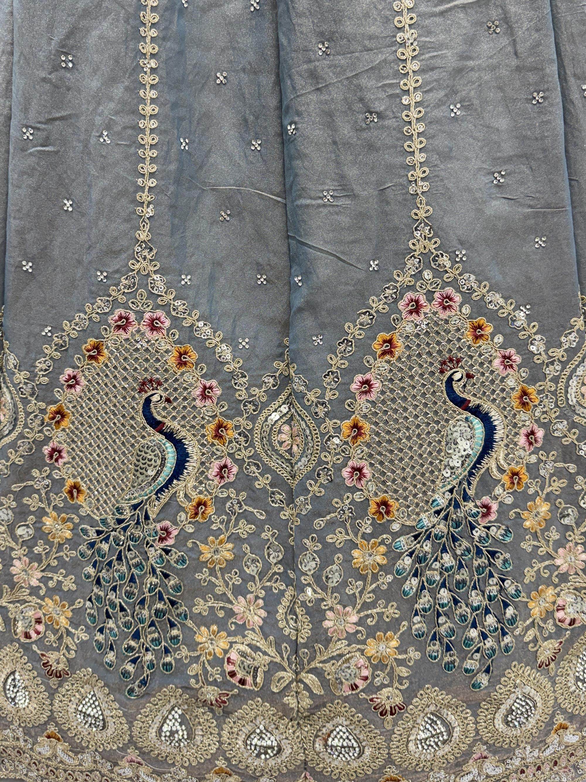 The lehenga comes in a beautiful grey shade with rich peacock embroidery and sparkling sequin highlights. Its detailed thread work and zircon diamond touches give it a royal festive look.