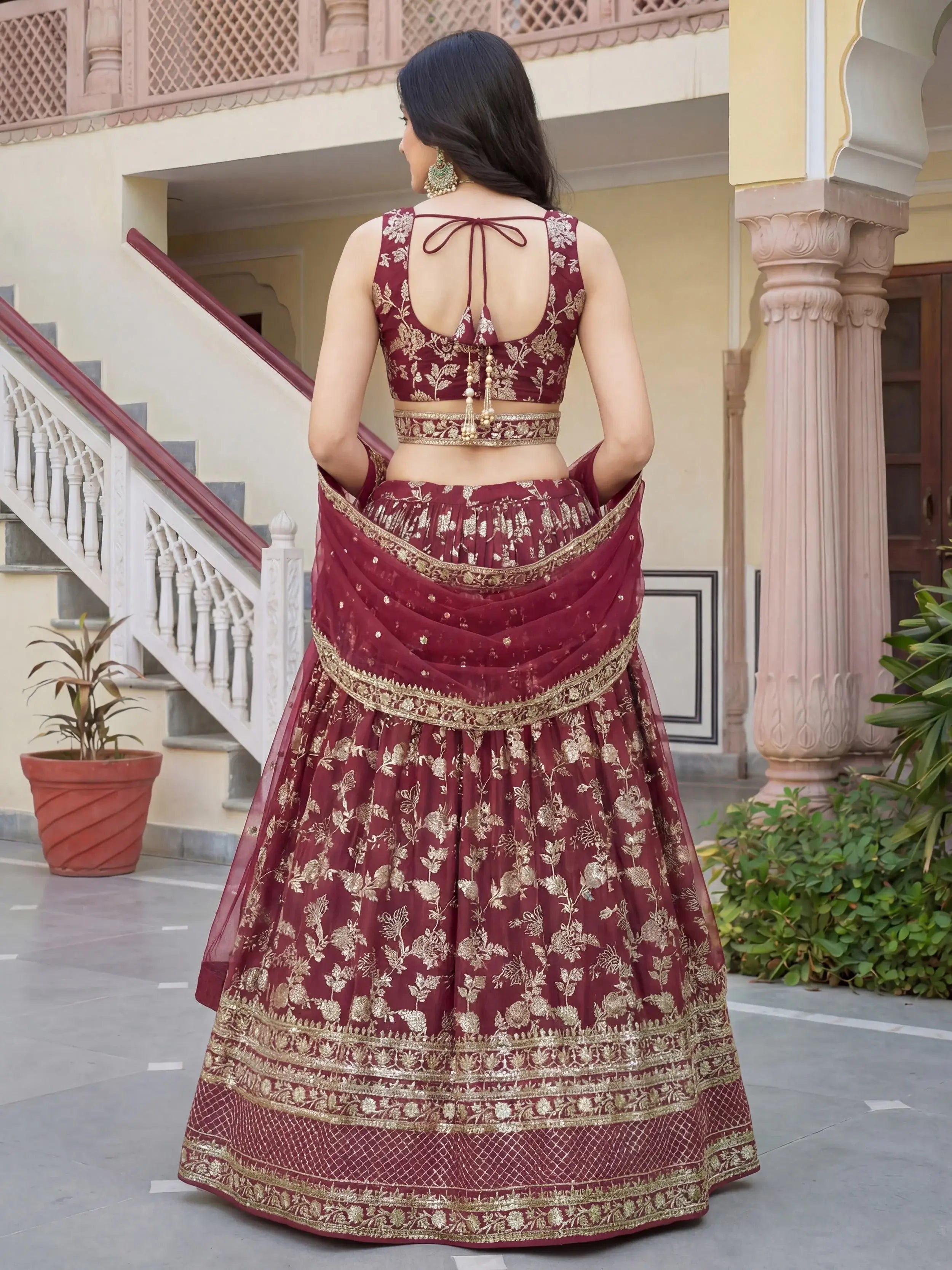 The lehenga features a rich maroon colour adorned with intricate zari, dori, sequins, and thread work. Crafted in premium dola silk, its 3.5-meter flair and detailed floral embroidery enhance its regal appeal.