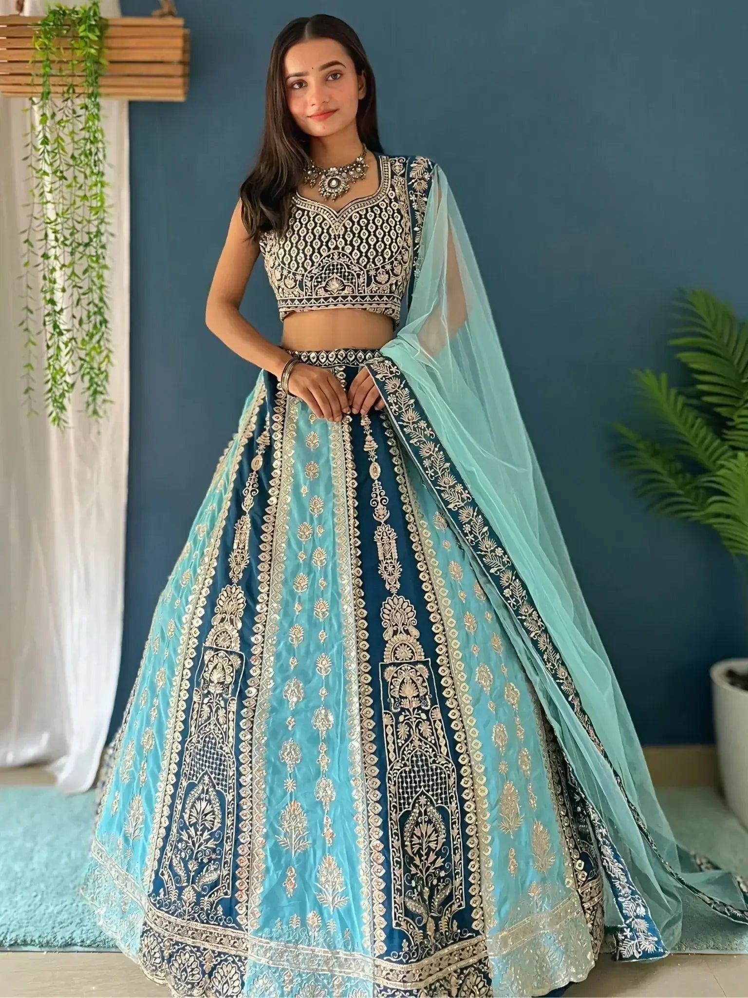Accompanying the lehenga is a sky-blue net dupatta, designed with a similar embroidery pattern and finished with a lace border. The dupatta adds an extra layer of grace and versatility, whether draped traditionally or styled with a modern flair. This thoughtful pairing completes the outfit, making it ideal for a variety of occasions, from family gatherings to festive celebrations.
