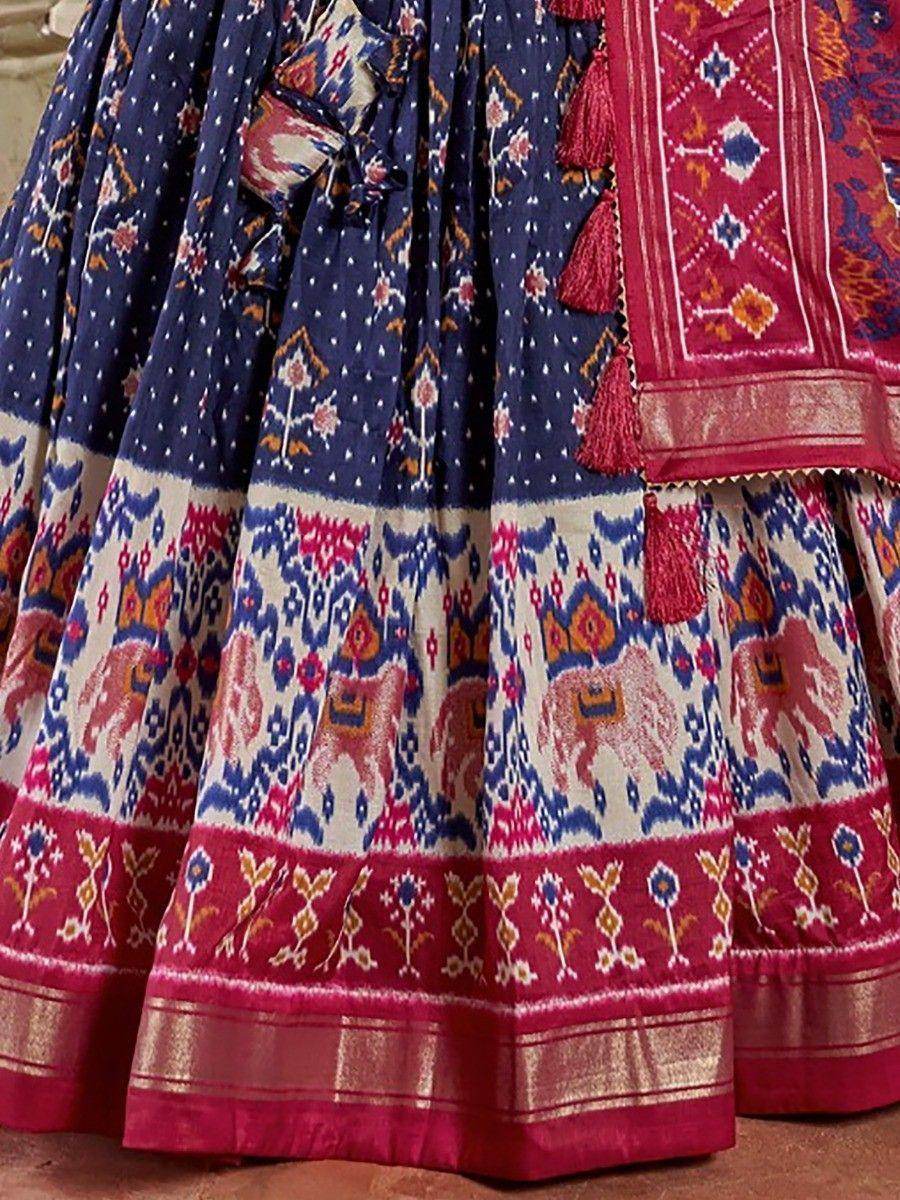 Introducing the amazing navy blue patola printed silk lehenga choli with dupatta, a stunning outfit that combines traditional charm with contemporary style. Crafted with precision and care, this navy blue lehenga set is made from high-quality tussar silk material, ensuring comfort and durability.