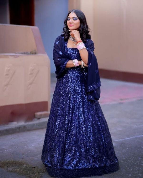 The lehenga comes in a rich navy blue color, which adds a touch of elegance and sophistication to your look. It is semi-stitched up to 42 inches, ensuring a comfortable and flattering fit for most body types. The lehenga has a 3.50-meter flair, allowing for graceful movements and a regal presence.