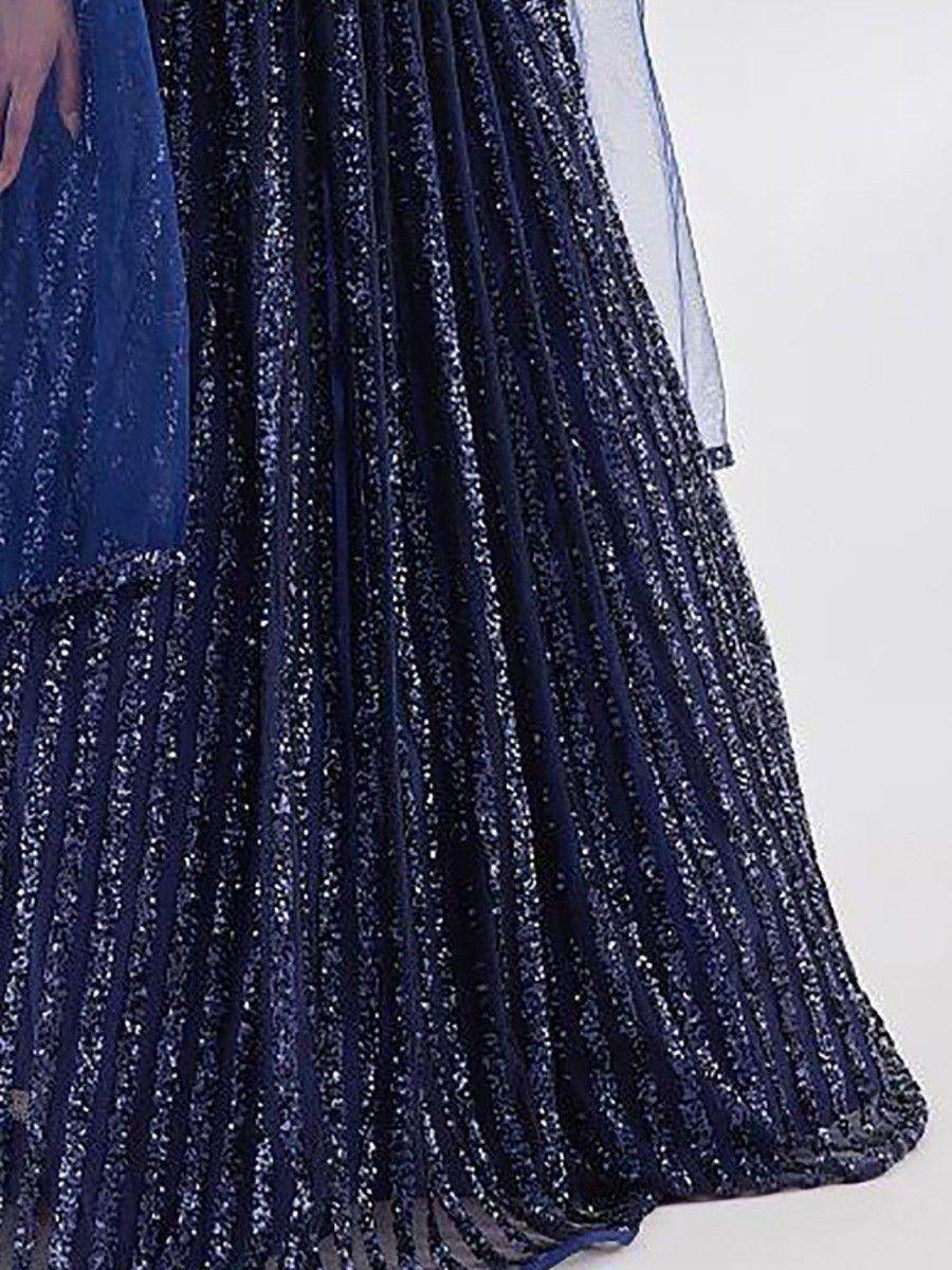 Theastonishing blue sequins net party wear lehenga choli with dupatta is made from high-quality georgette fabric, ensuring comfort and durability. The intricate sequins work and thread embroidery further enhance its visual appeal, making it a standout choice for any occasion. With its sleeveless design, this lehenga choli is both stylish and practical.